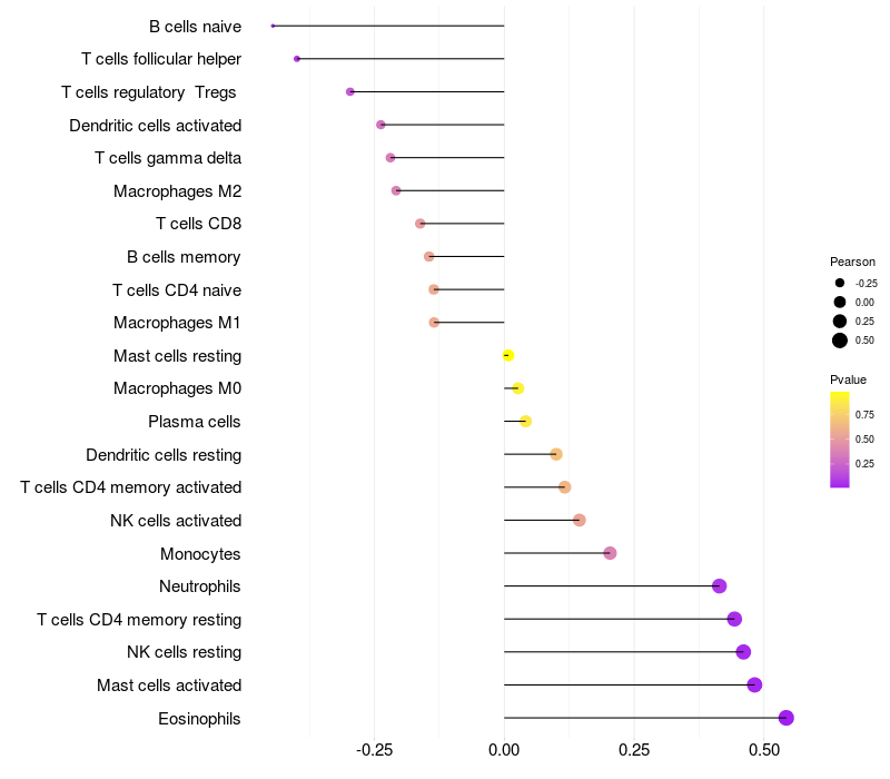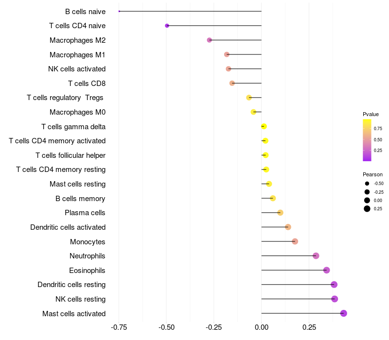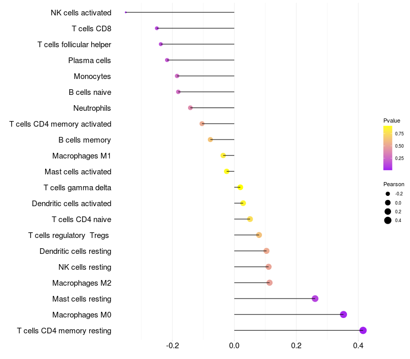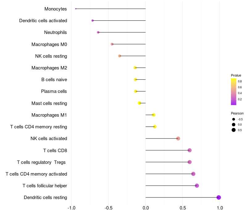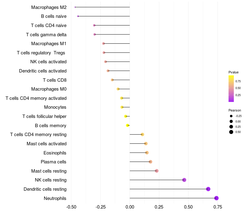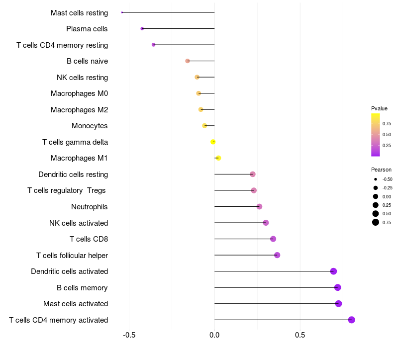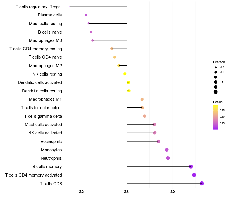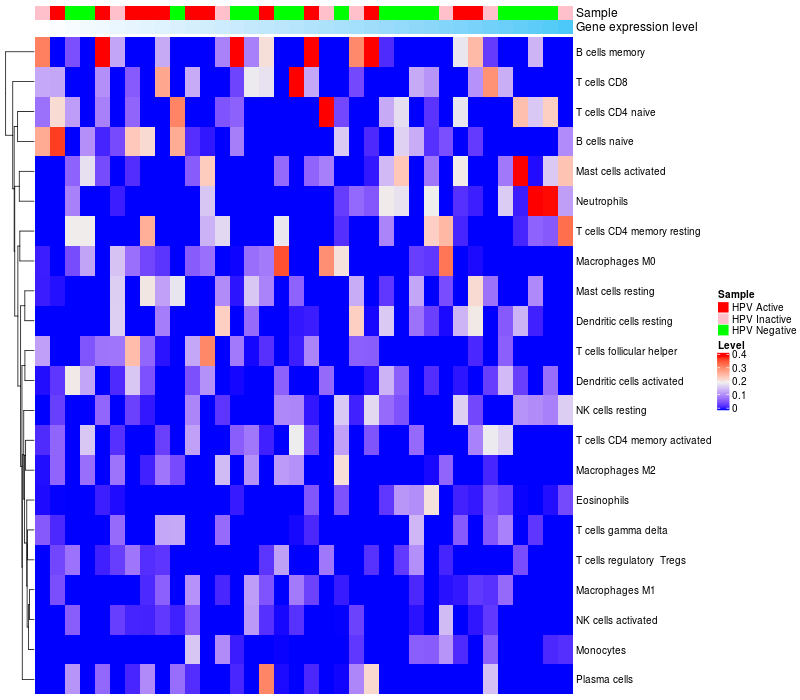HeatMap of cell type fractions in all samples Lollipop of HTR1B expression and immune infiltrating cell level correlation result in HPV+ samples