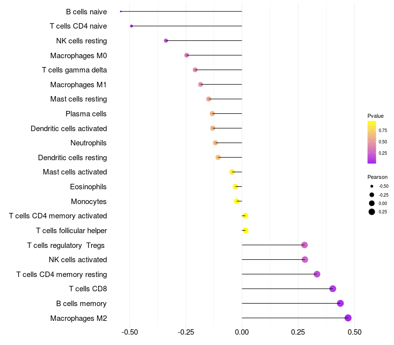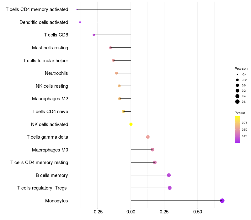 Lollipop of HTRA1 expression and immune infiltrating cell level correlation result in HTLV1+ samples
