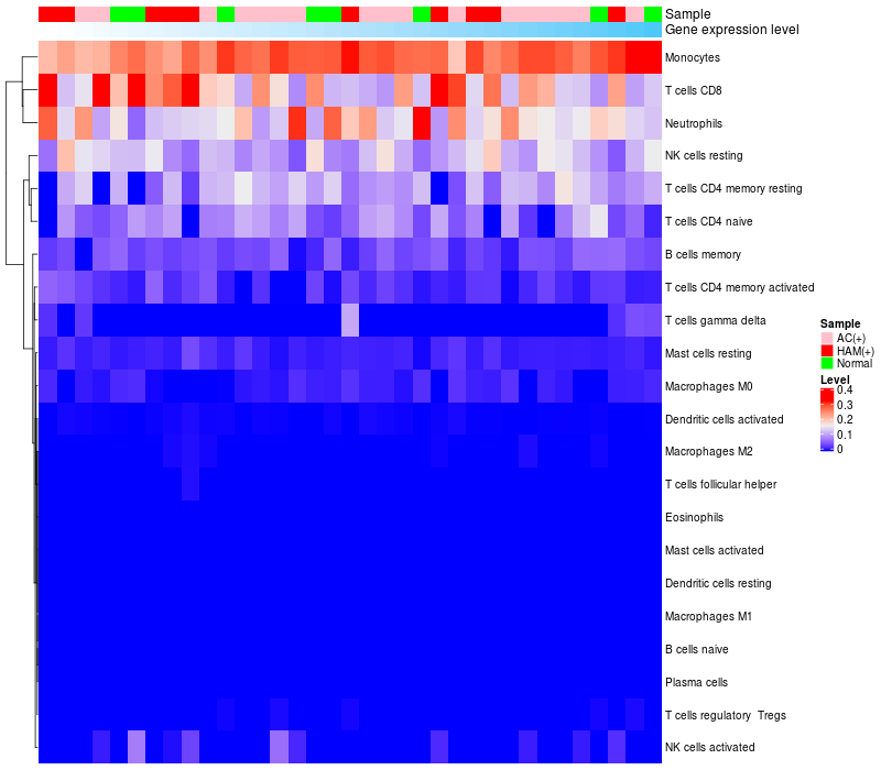 Normal (8), Asymptomatic carriers (HTLV1+)(17), HTLV-1-associated myelopathy (HTLV1+)(10) |