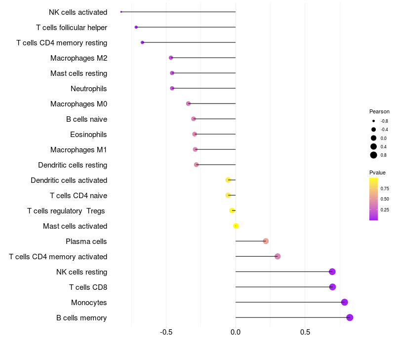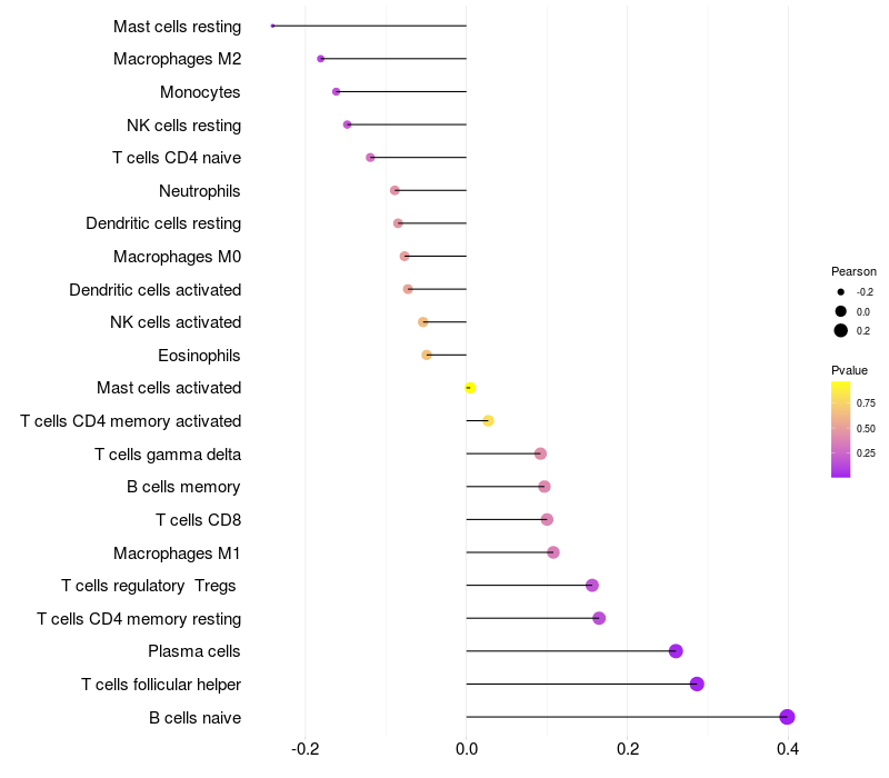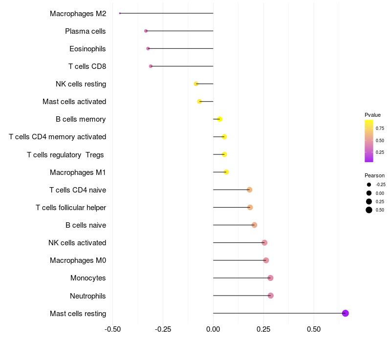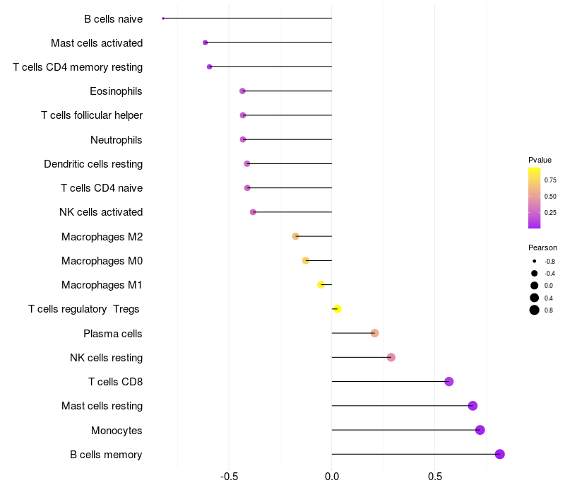 Lollipop of HVCN1 expression and immune infiltrating cell level correlation result in HBV+ Liver cirrhosis samples