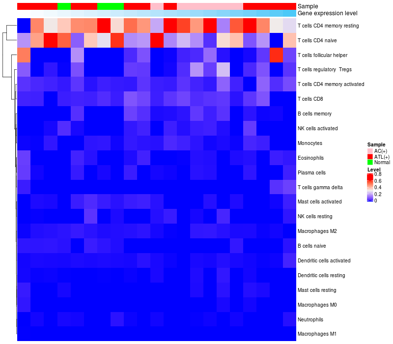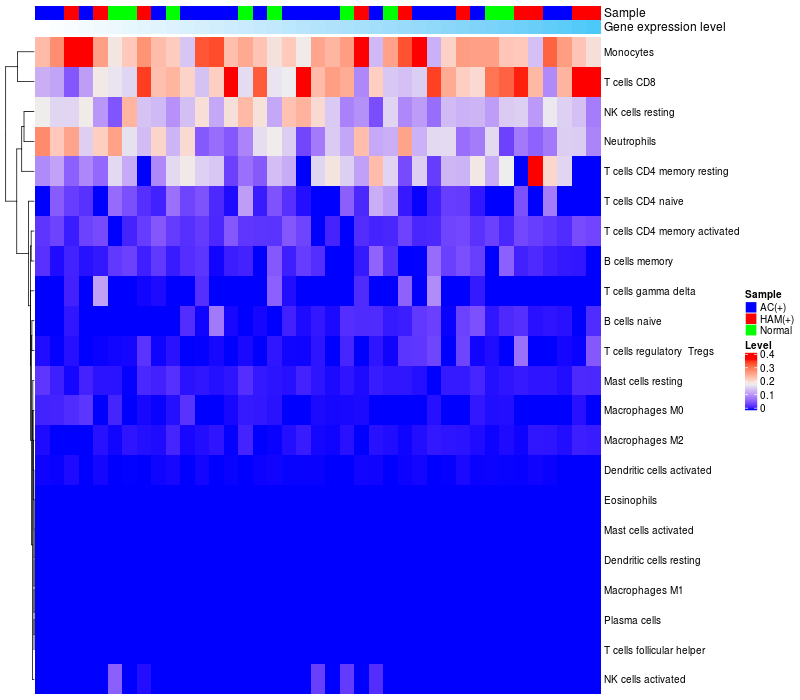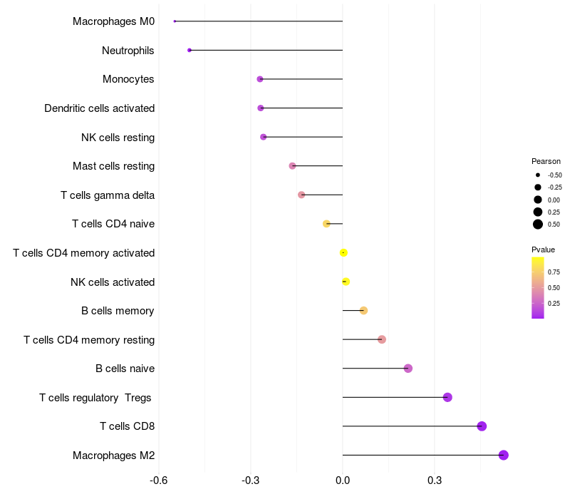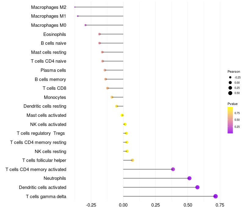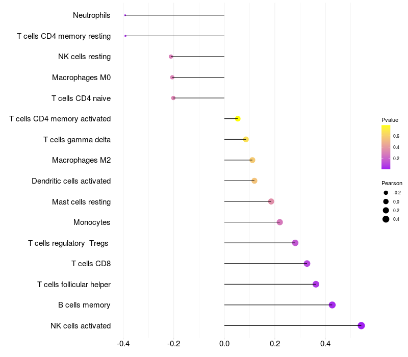 Lollipop of IAH1 expression and immune infiltrating cell level correlation result in HTLV1+ samples