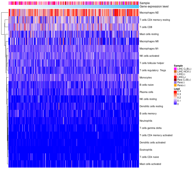 Liver hepatocellular carcinoma HCV (HBV+)(86), Liver hepatocellular carcinoma HCV (HBV-)(19), Liver hepatocellular carcinoma (HBV+)(209), Liver hepatocellular carcinoma (HBV+)(60), Paracancerous HCV (HBV+)(4), Paracancerous (HBV-)(28), Paracancerous (HBV+)(18) |