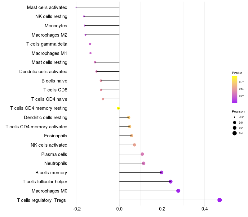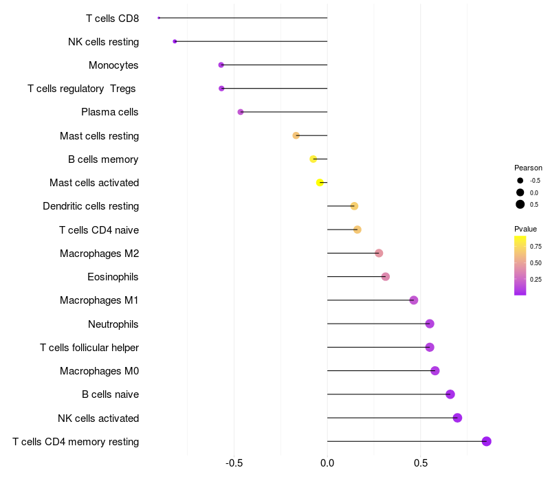 Lollipop of IGF2BP2 expression and immune infiltrating cell level correlation result in HBV+ Liver cirrhosis samples