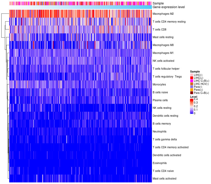 Liver hepatocellular carcinoma HCV (HBV+)(86), Liver hepatocellular carcinoma HCV (HBV-)(19), Liver hepatocellular carcinoma (HBV+)(209), Liver hepatocellular carcinoma (HBV+)(60), Paracancerous HCV (HBV+)(4), Paracancerous (HBV-)(28), Paracancerous (HBV+)(18) |