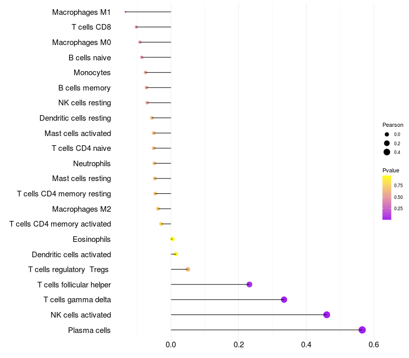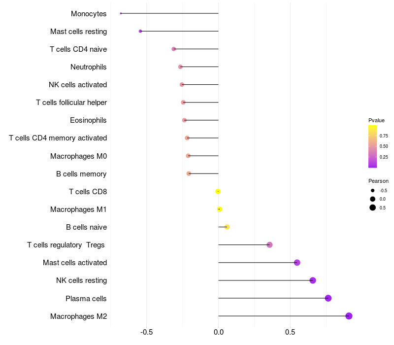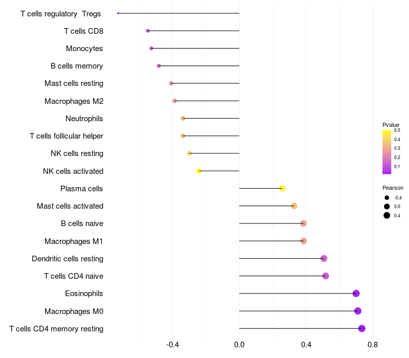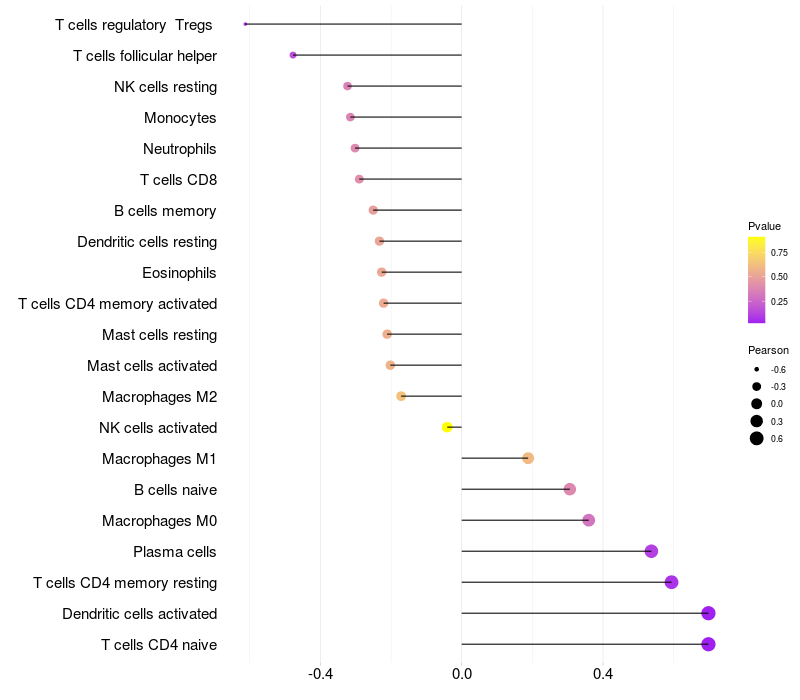 Lollipop of IGFBP5 expression and immune infiltrating cell level correlation result in HBV+ Liver cirrhosis samples