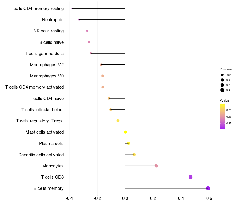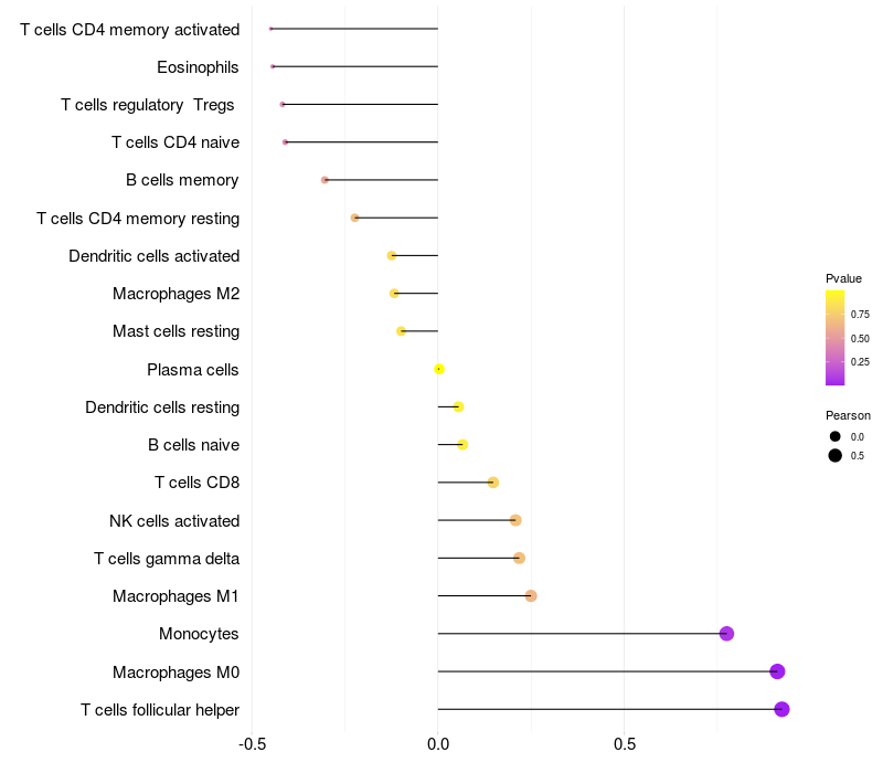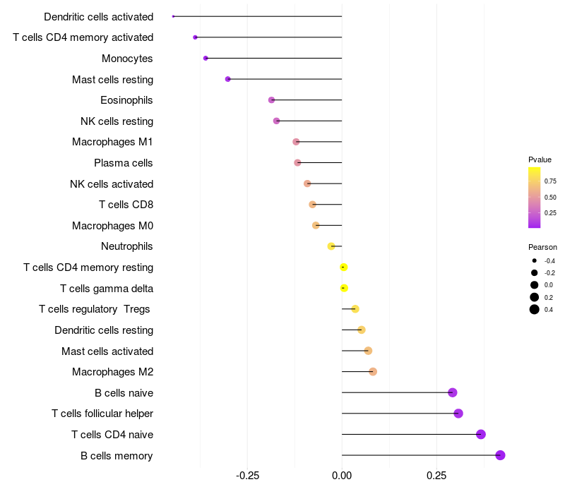 Lollipop of IGH expression and immune infiltrating cell level correlation result in EBV+ samples