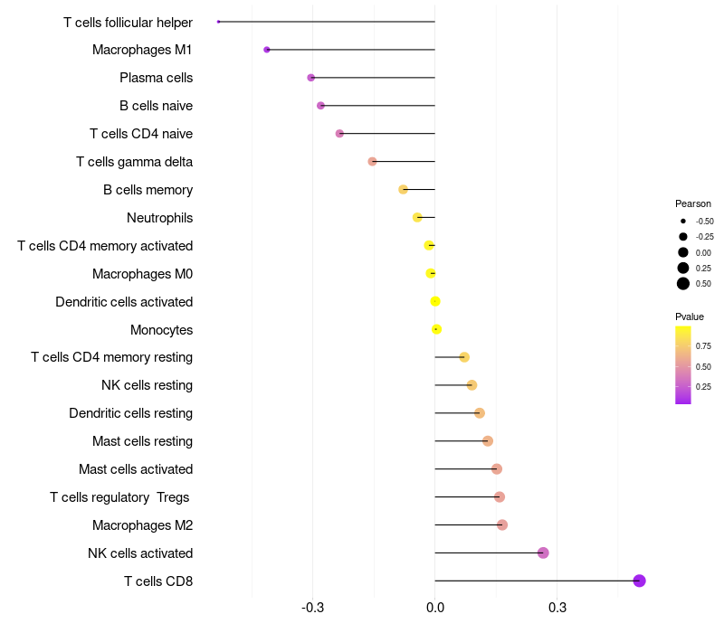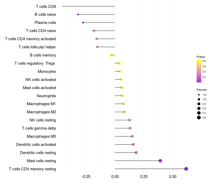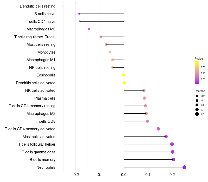 Lollipop of IGSF3 expression and immune infiltrating cell level correlation result in HPV+ samples