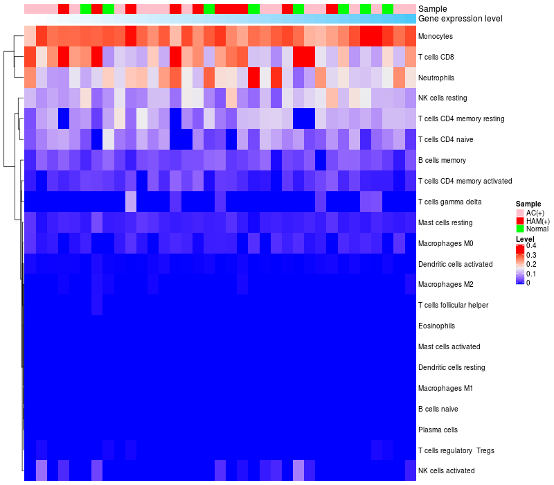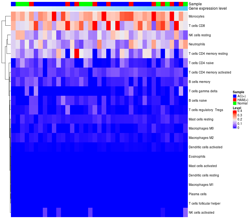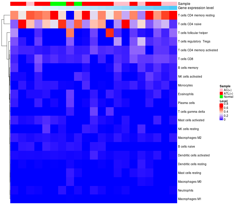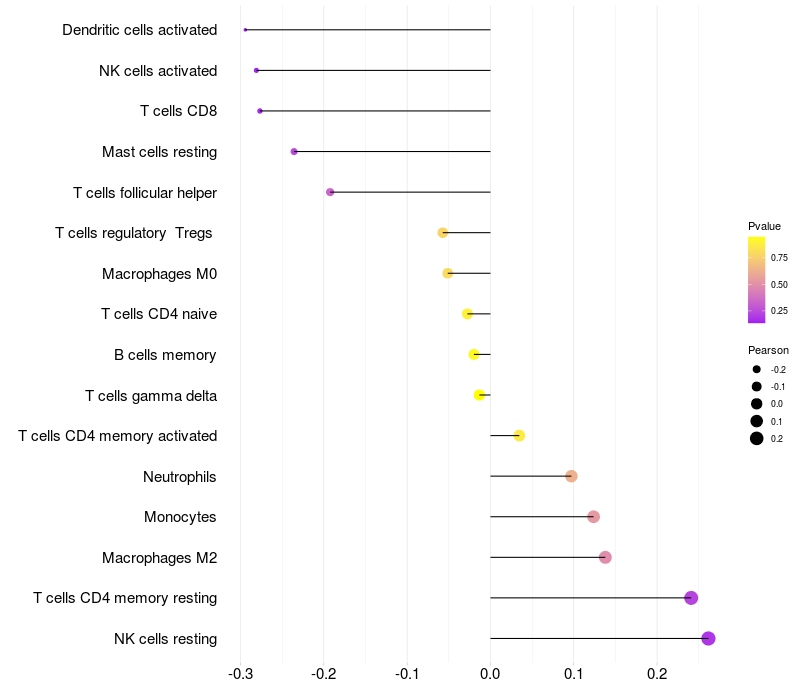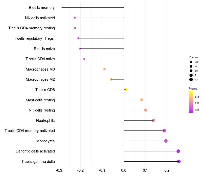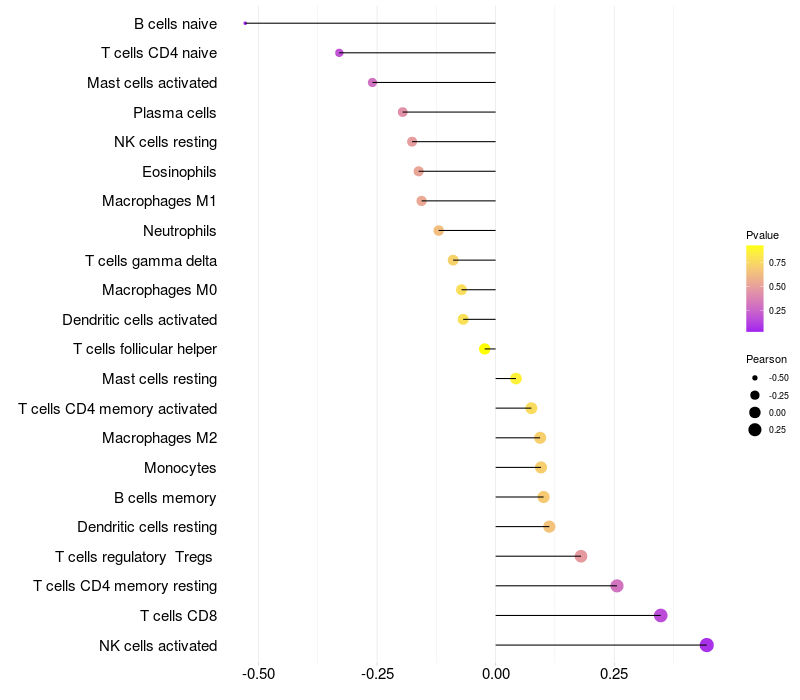 Lollipop of IL22 expression and immune infiltrating cell level correlation result in HTLV1+ samples