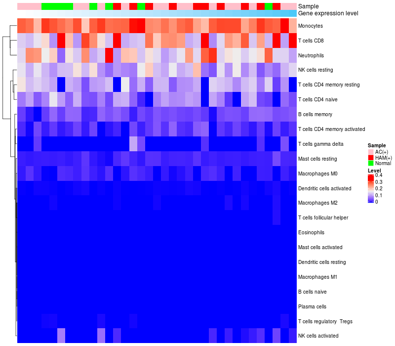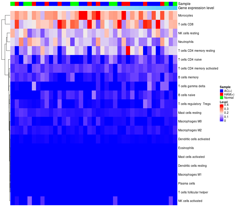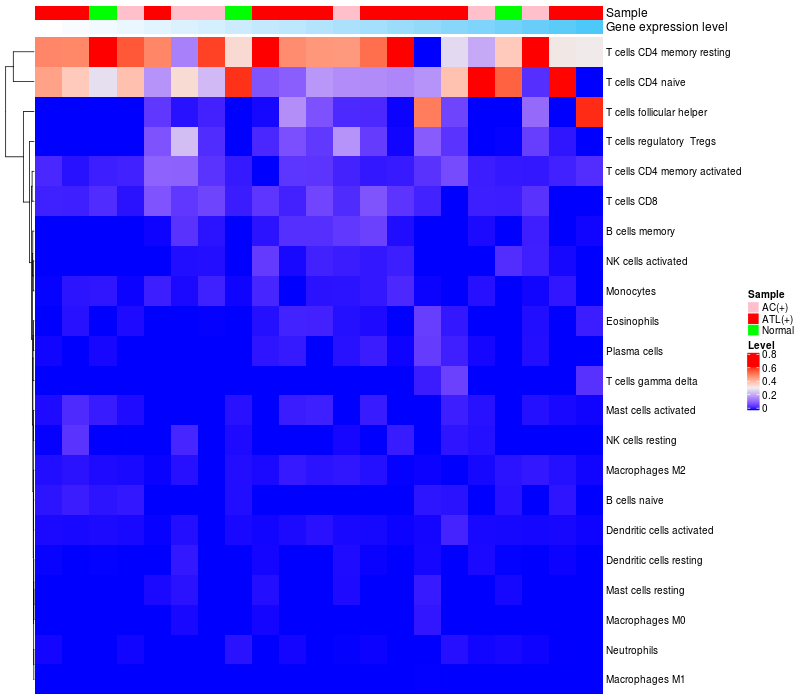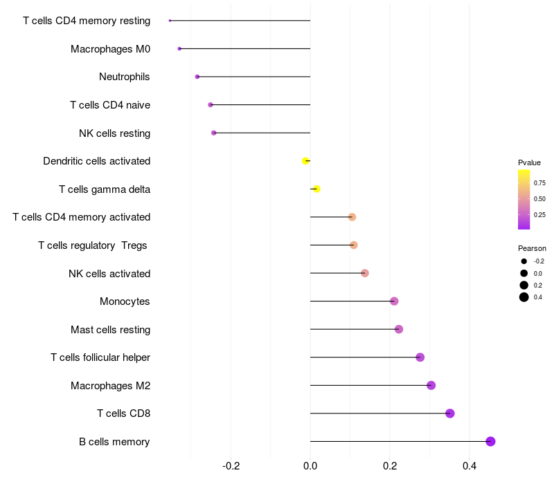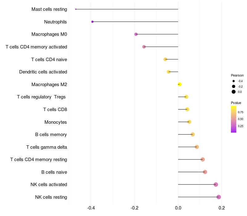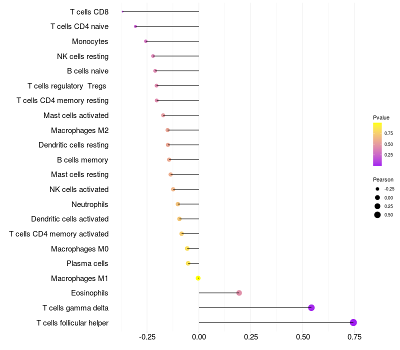 Lollipop of IL26 expression and immune infiltrating cell level correlation result in HTLV1+ samples
