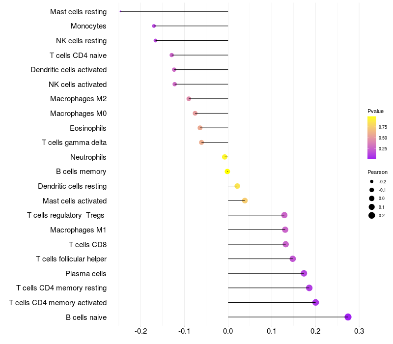 Lollipop of IL2RA expression and immune infiltrating cell level correlation result in HBV+ samples