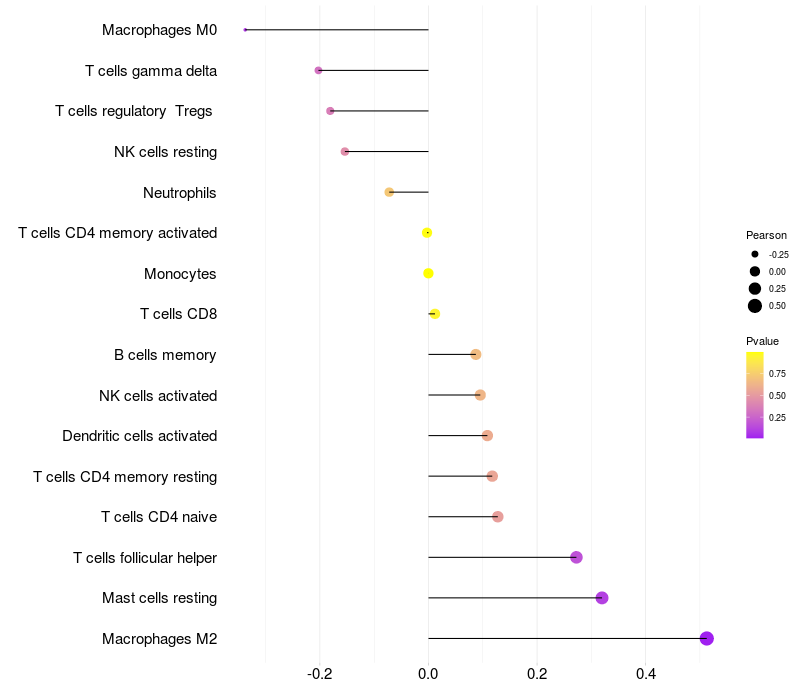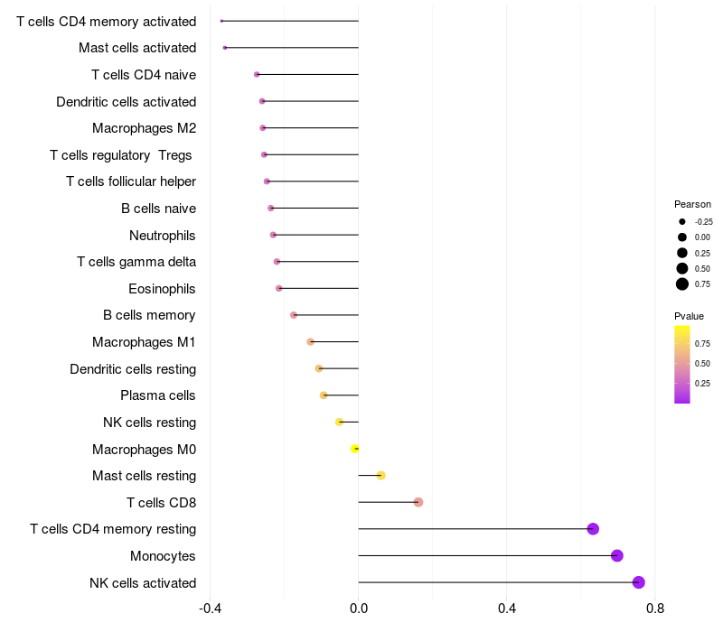 Lollipop of IL5RA expression and immune infiltrating cell level correlation result in HTLV1+ samples