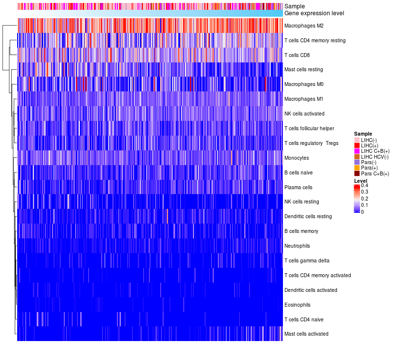 Liver hepatocellular carcinoma HCV (HBV+)(86), Liver hepatocellular carcinoma HCV (HBV-)(19), Liver hepatocellular carcinoma (HBV+)(209), Liver hepatocellular carcinoma (HBV+)(60), Paracancerous HCV (HBV+)(4), Paracancerous (HBV-)(28), Paracancerous (HBV+)(18) |