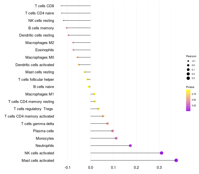 Lollipop of IL6 expression and immune infiltrating cell level correlation result in HBV+ samples