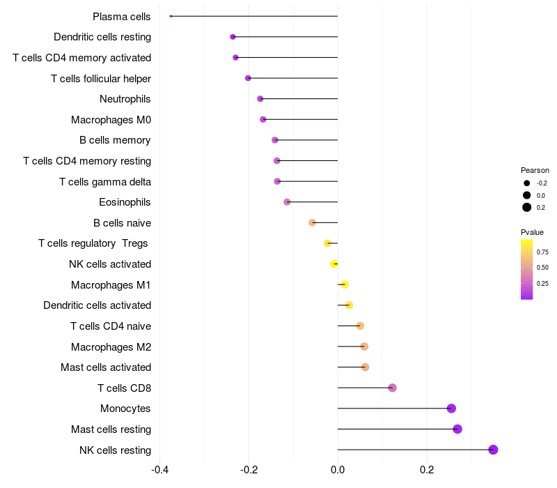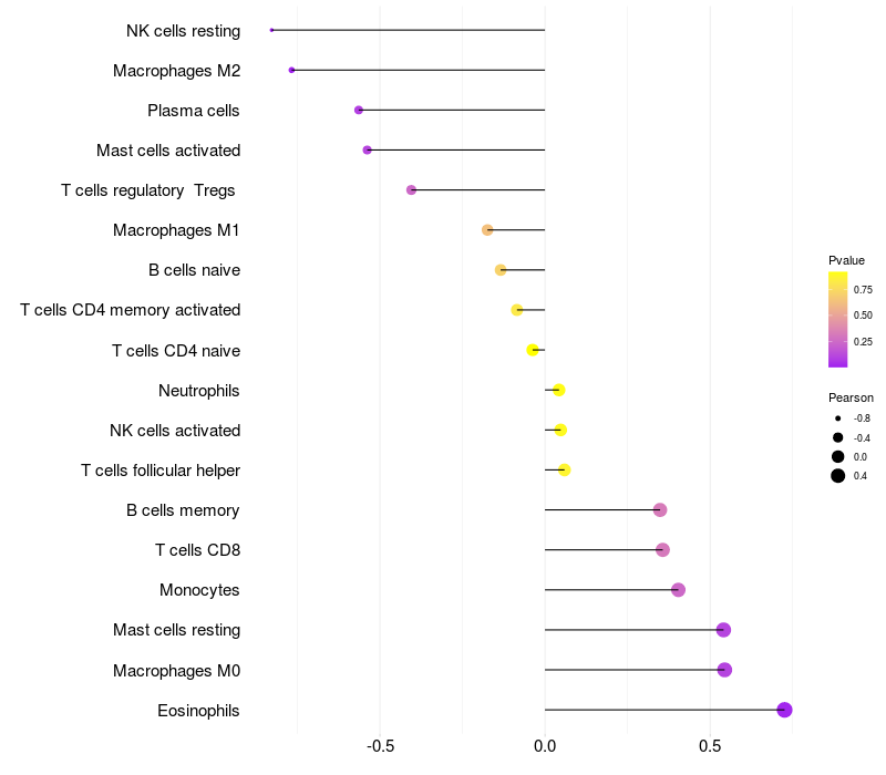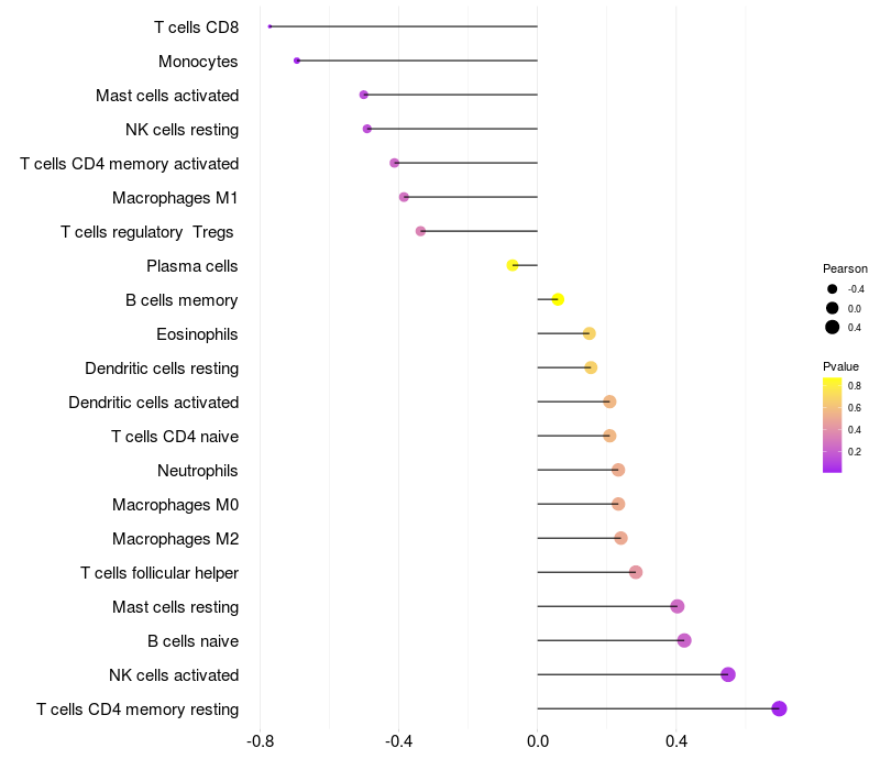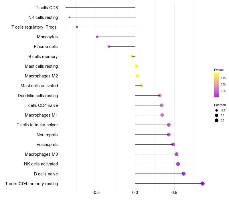Lollipop of IMMP2L expression and immune infiltrating cell level correlation result in HBV+ Liver cirrhosis samples
