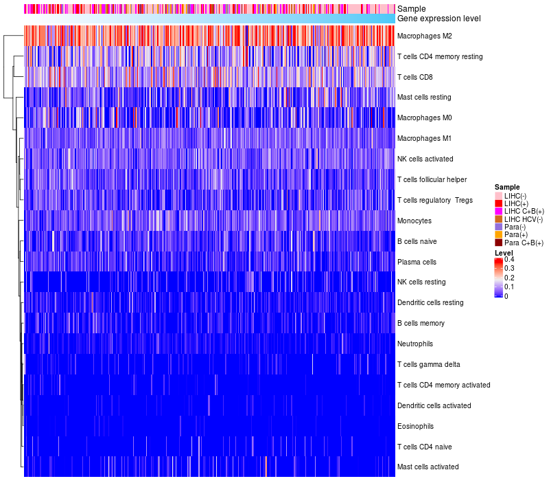 Liver hepatocellular carcinoma HCV (HBV+)(86), Liver hepatocellular carcinoma HCV (HBV-)(19), Liver hepatocellular carcinoma (HBV+)(209), Liver hepatocellular carcinoma (HBV+)(60), Paracancerous HCV (HBV+)(4), Paracancerous (HBV-)(28), Paracancerous (HBV+)(18) |