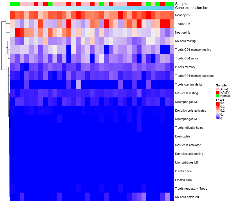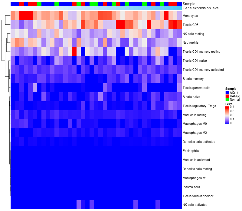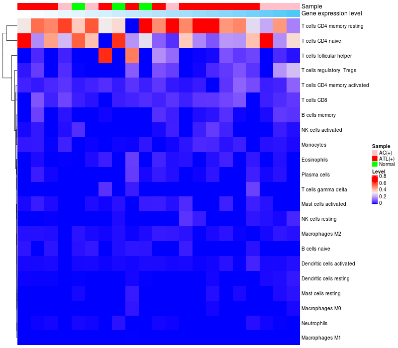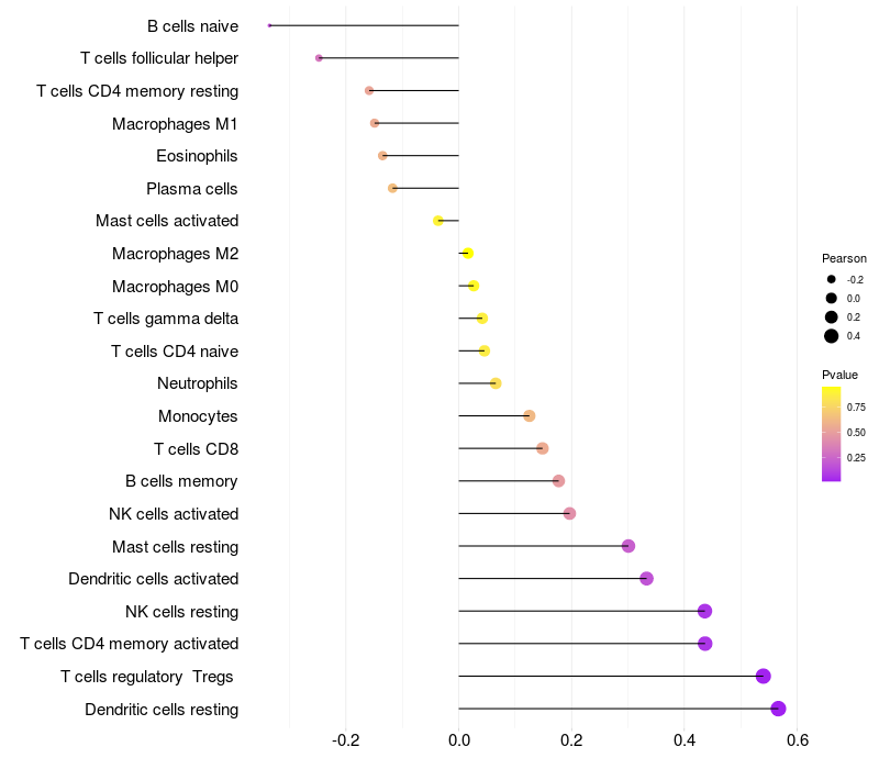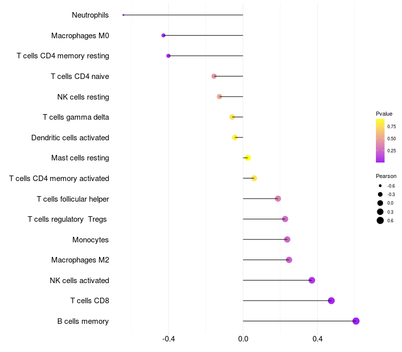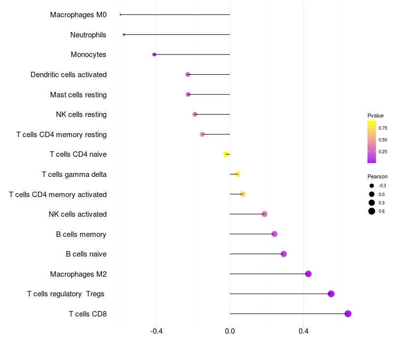 Lollipop of IMP4 expression and immune infiltrating cell level correlation result in HTLV1+ samples