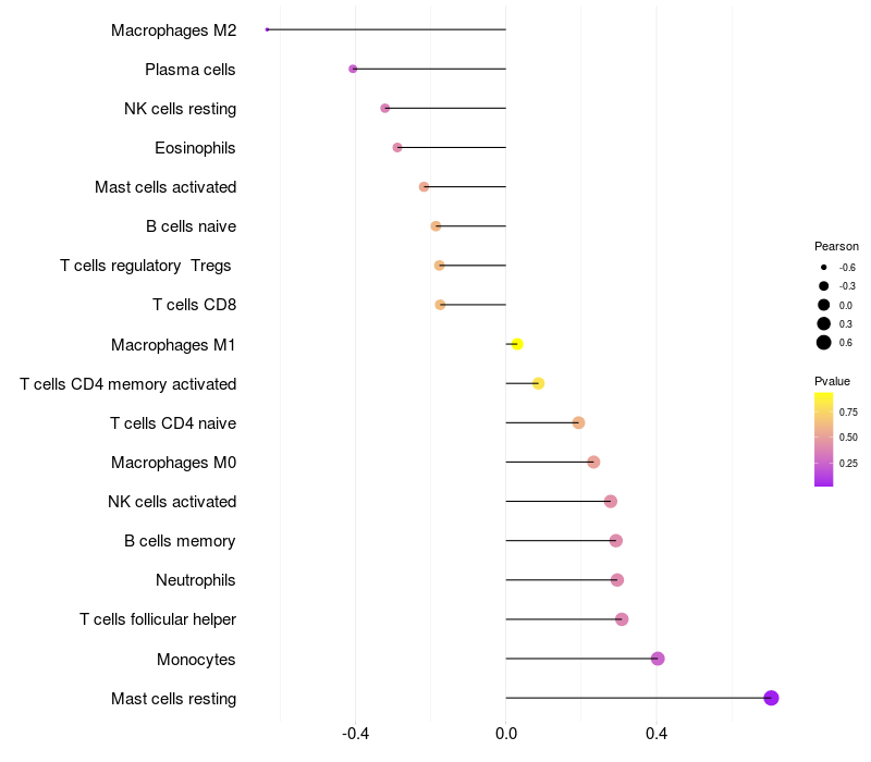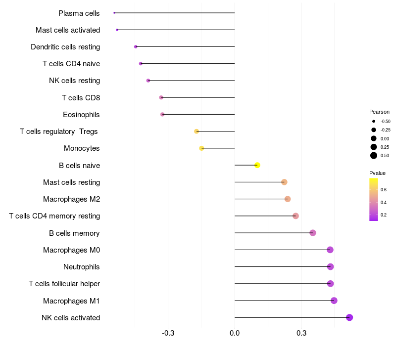 Lollipop of INTS6 expression and immune infiltrating cell level correlation result in HBV+ Liver cirrhosis samples