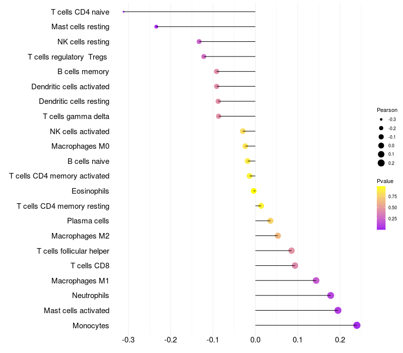 Lollipop of INTS6 expression and immune infiltrating cell level correlation result in HBV+ Chronic HBV (CHB) infection samples