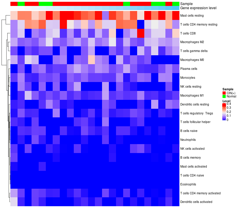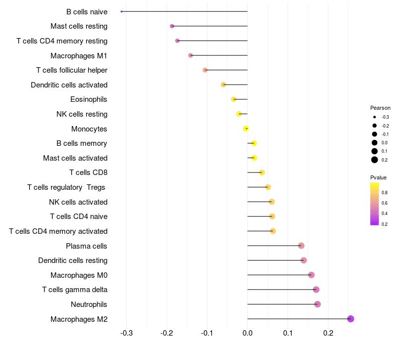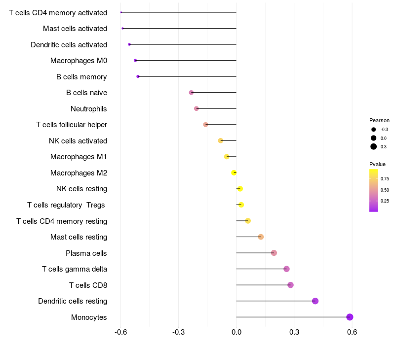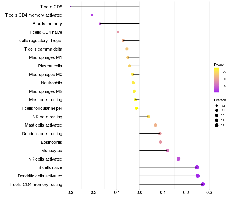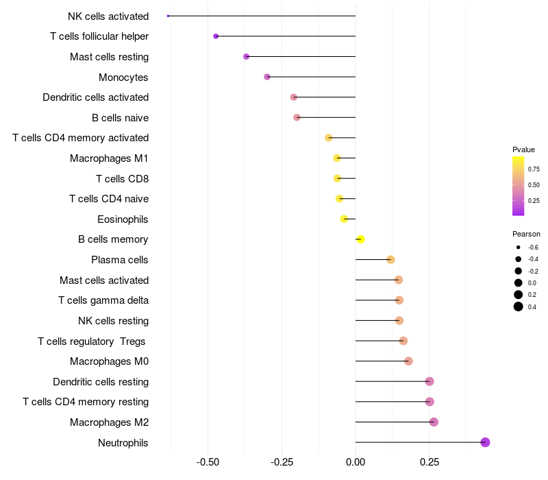 Lollipop of INTU expression and immune infiltrating cell level correlation result in HPV+ samples