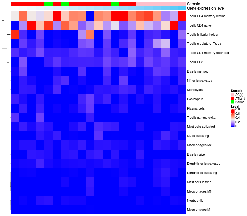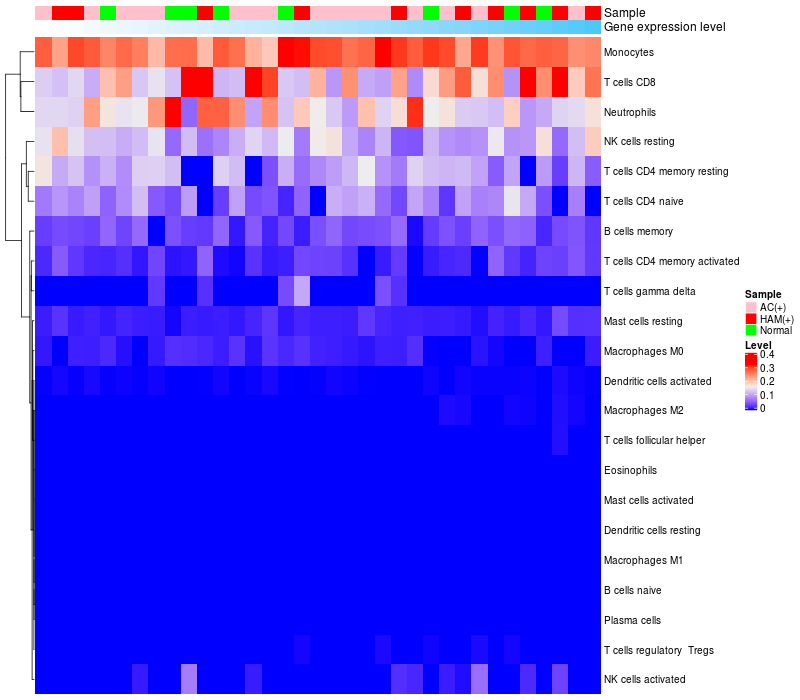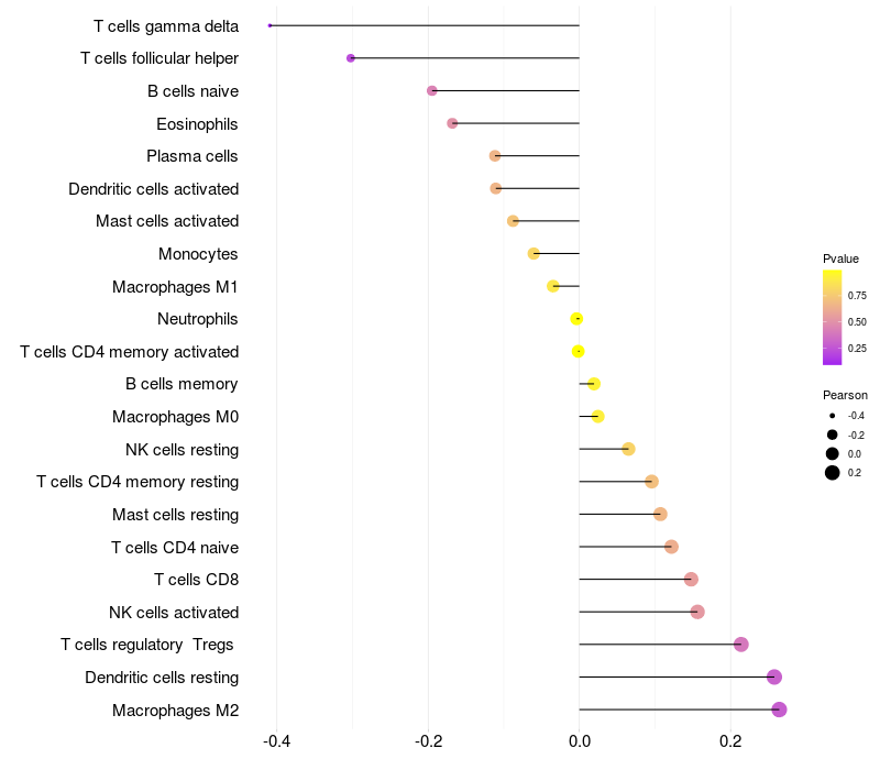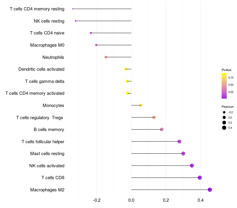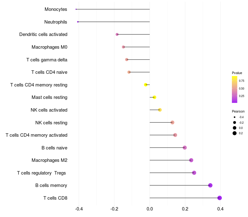 Lollipop of IPO4 expression and immune infiltrating cell level correlation result in HTLV1+ samples