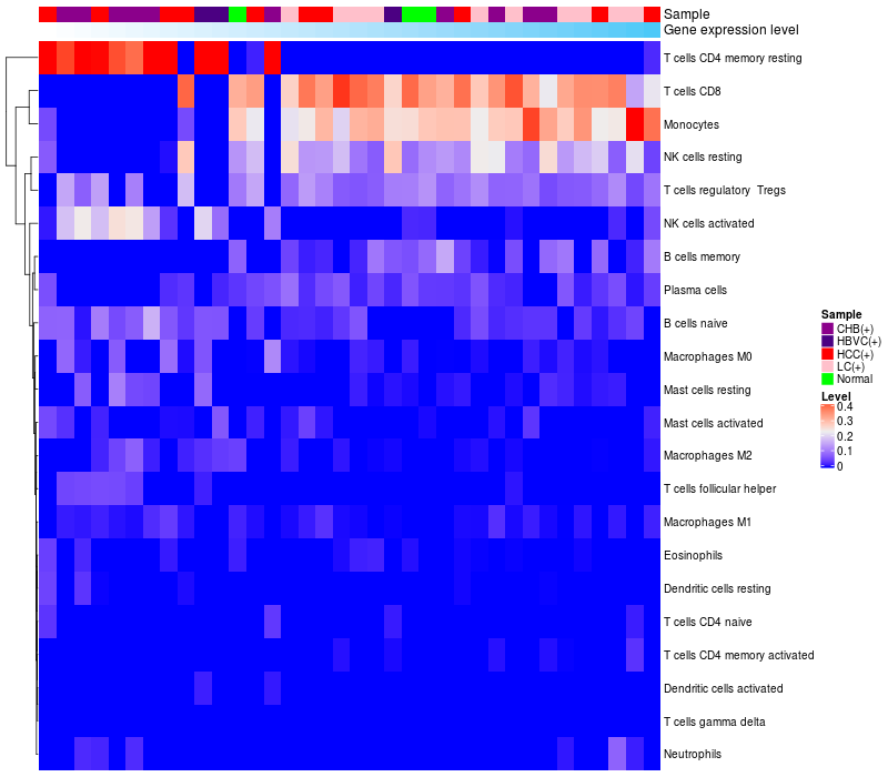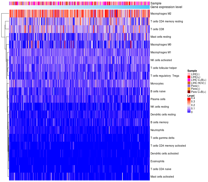 Liver hepatocellular carcinoma HCV (HBV+)(86), Liver hepatocellular carcinoma HCV (HBV-)(19), Liver hepatocellular carcinoma (HBV+)(209), Liver hepatocellular carcinoma (HBV+)(60), Paracancerous HCV (HBV+)(4), Paracancerous (HBV-)(28), Paracancerous (HBV+)(18) |