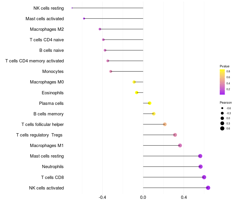 Lollipop of IQSEC2 expression and immune infiltrating cell level correlation result in HBV+ Chronic HBV (CHB) infection samples