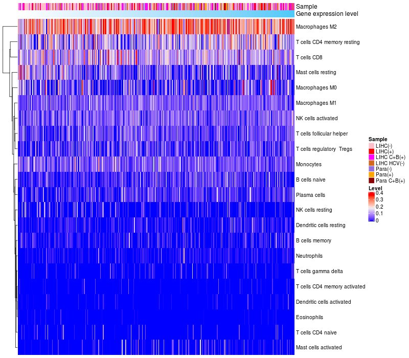 Liver hepatocellular carcinoma HCV (HBV+)(86), Liver hepatocellular carcinoma HCV (HBV-)(19), Liver hepatocellular carcinoma (HBV+)(209), Liver hepatocellular carcinoma (HBV+)(60), Paracancerous HCV (HBV+)(4), Paracancerous (HBV-)(28), Paracancerous (HBV+)(18) |