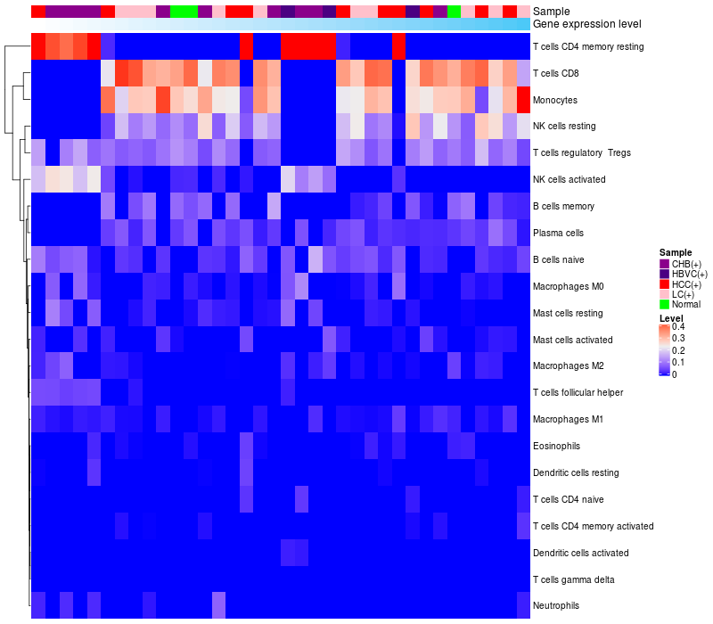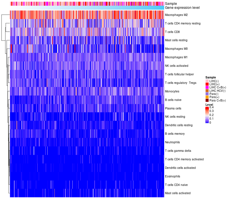 Liver hepatocellular carcinoma HCV (HBV+)(86), Liver hepatocellular carcinoma HCV (HBV-)(19), Liver hepatocellular carcinoma (HBV+)(209), Liver hepatocellular carcinoma (HBV+)(60), Paracancerous HCV (HBV+)(4), Paracancerous (HBV-)(28), Paracancerous (HBV+)(18) |