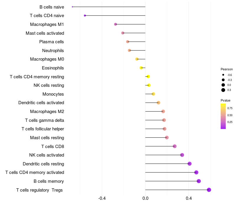 Lollipop of IRAK3 expression and immune infiltrating cell level correlation result in HTLV1+ samples