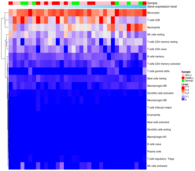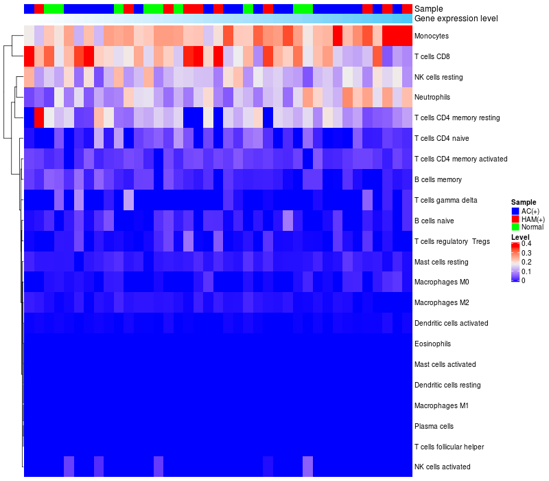 Normal (8), Asymptomatic carriers (HTLV1+)(17), HTLV-1-associated myelopathy (HTLV1+)(10) |