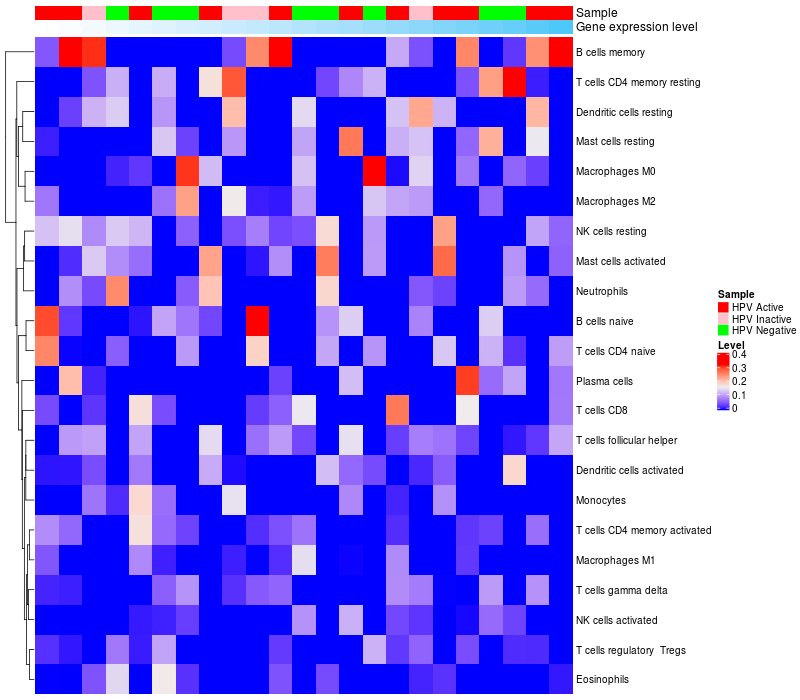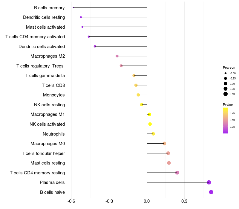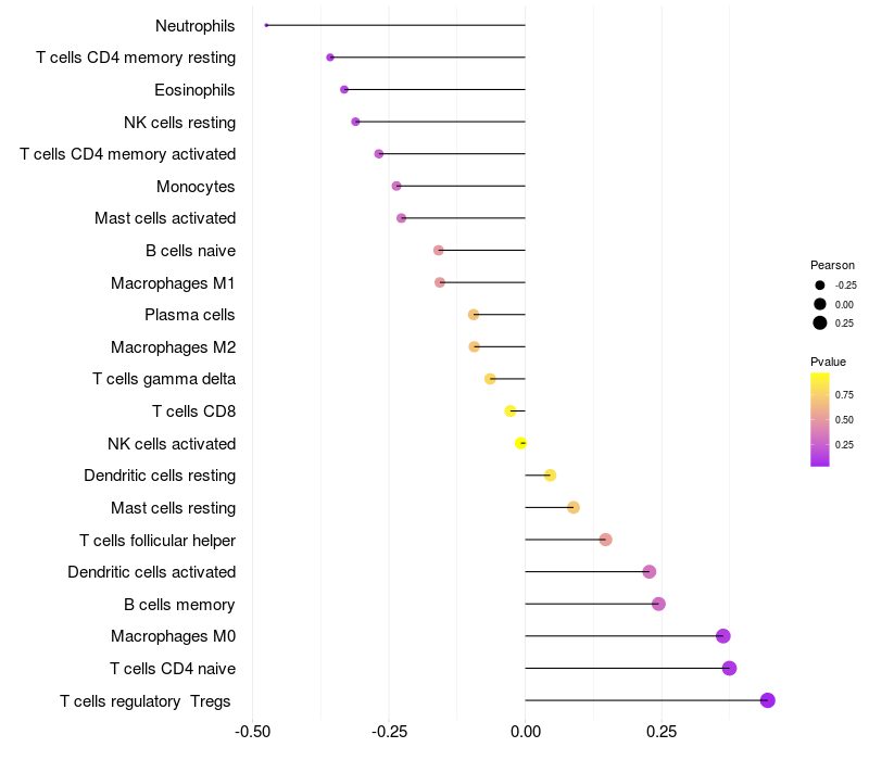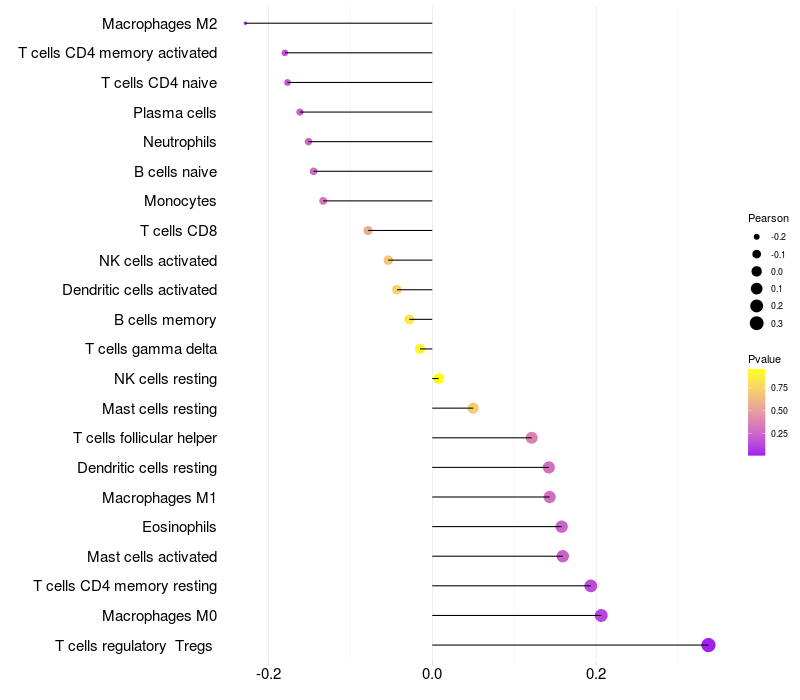 Lollipop of IRF2BP2 expression and immune infiltrating cell level correlation result in HPV+ samples