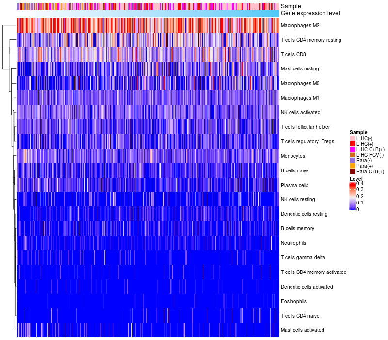 Liver hepatocellular carcinoma HCV (HBV+)(86), Liver hepatocellular carcinoma HCV (HBV-)(19), Liver hepatocellular carcinoma (HBV+)(209), Liver hepatocellular carcinoma (HBV+)(60), Paracancerous HCV (HBV+)(4), Paracancerous (HBV-)(28), Paracancerous (HBV+)(18) |