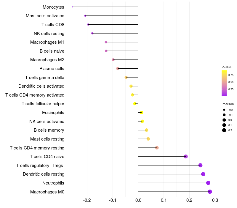 Lollipop of ITGA6 expression and immune infiltrating cell level correlation result in HBV+ samples