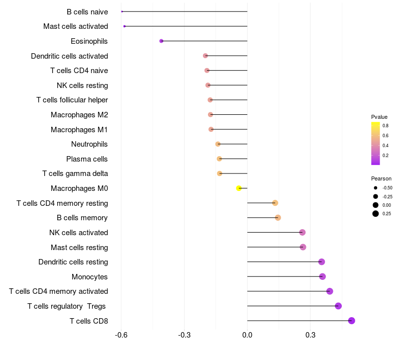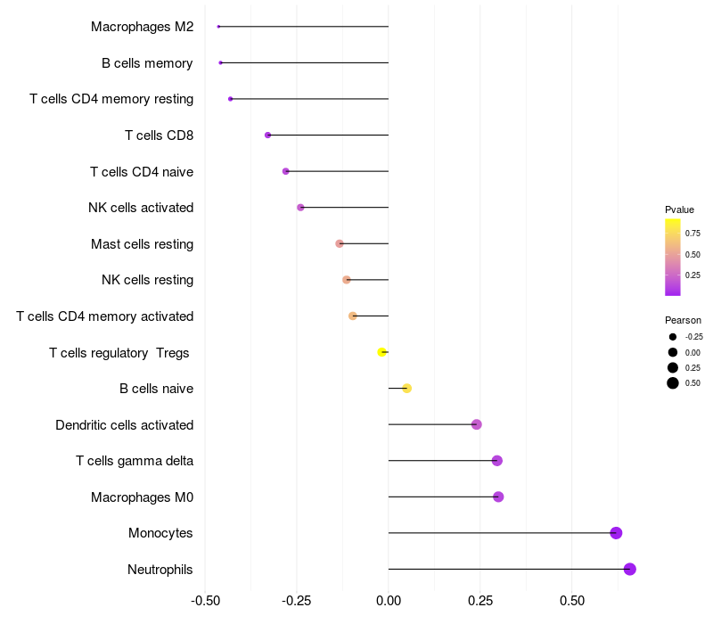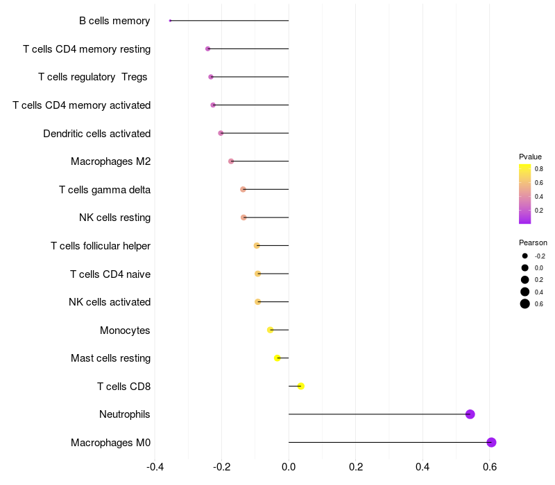 Lollipop of ITGB2 expression and immune infiltrating cell level correlation result in HTLV1+ samples