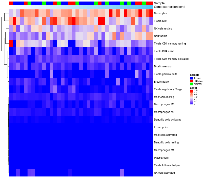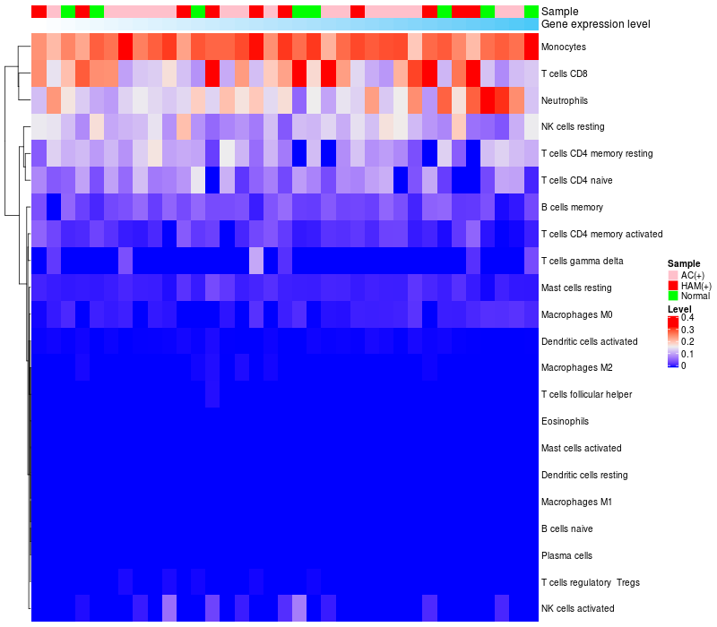 Normal (8), Asymptomatic carriers (HTLV1+)(17), HTLV-1-associated myelopathy (HTLV1+)(10) |