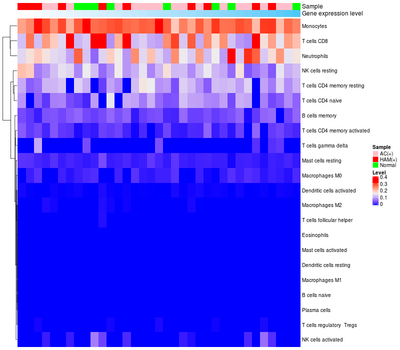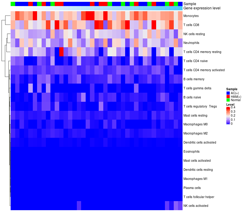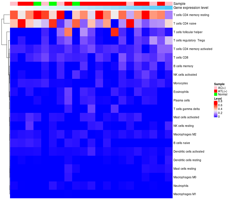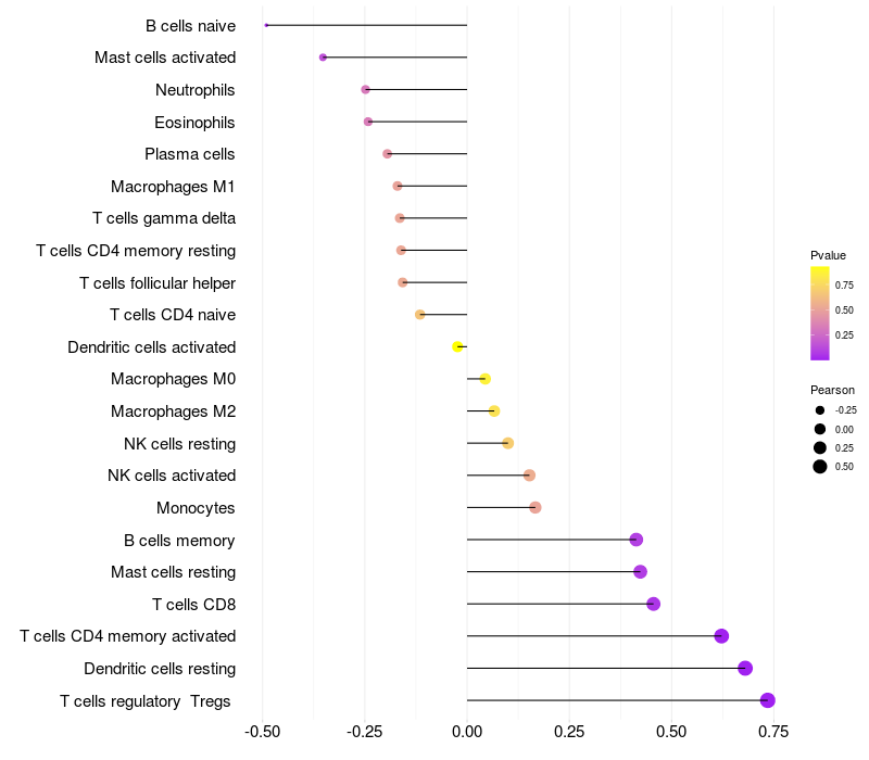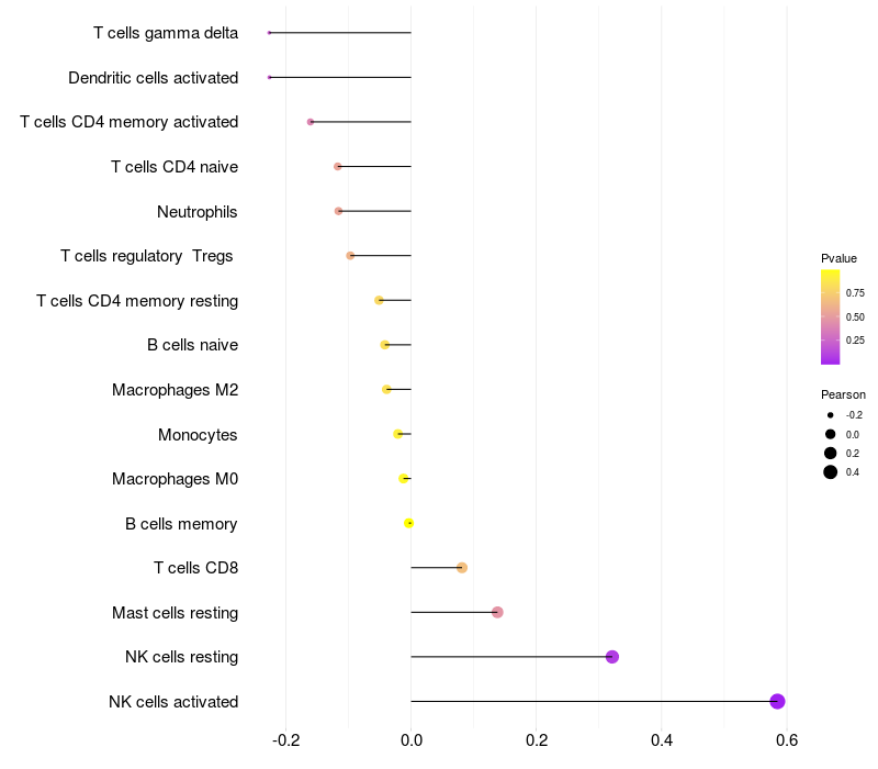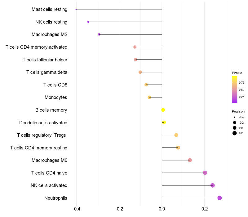Lollipop of ITGBL1 expression and immune infiltrating cell level correlation result in HTLV1+ samples