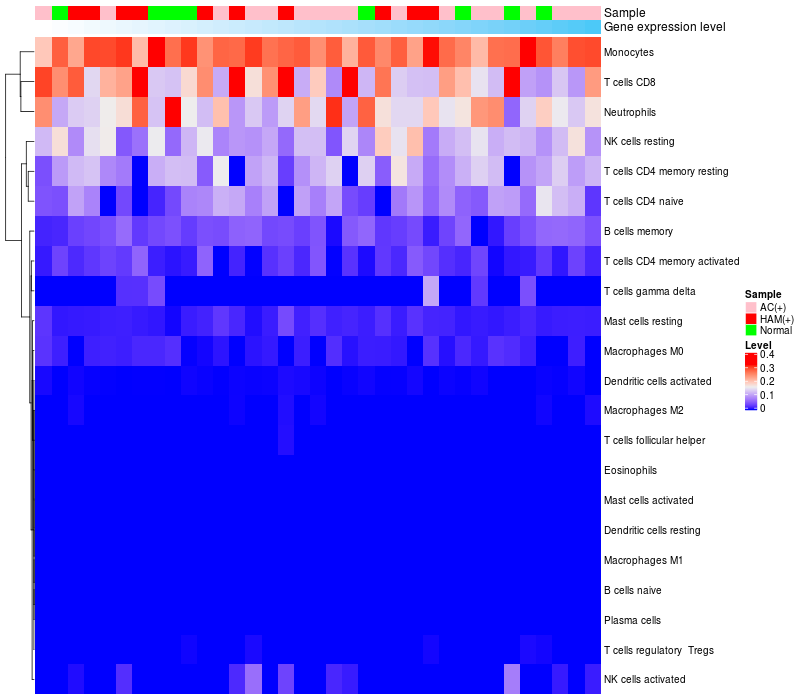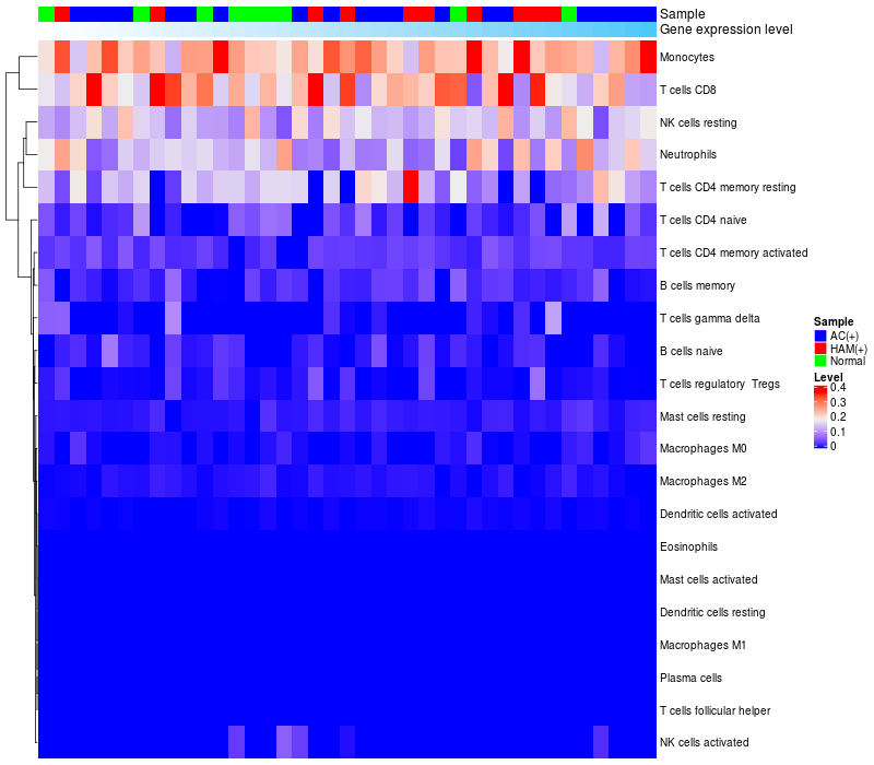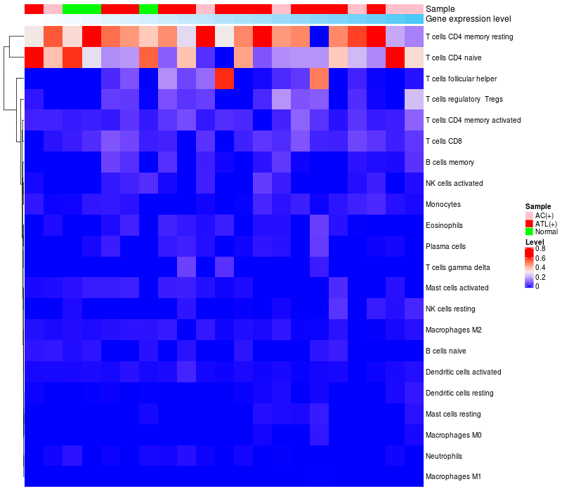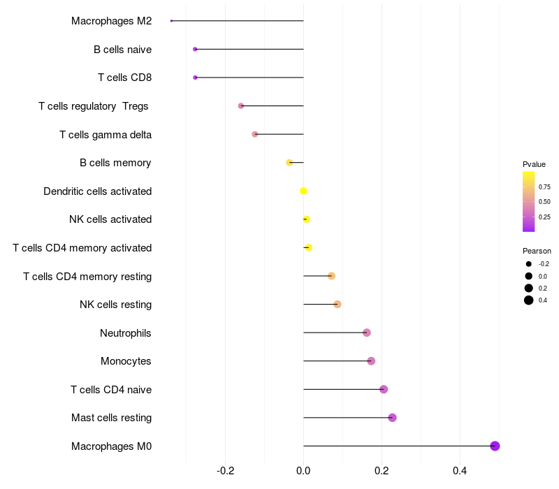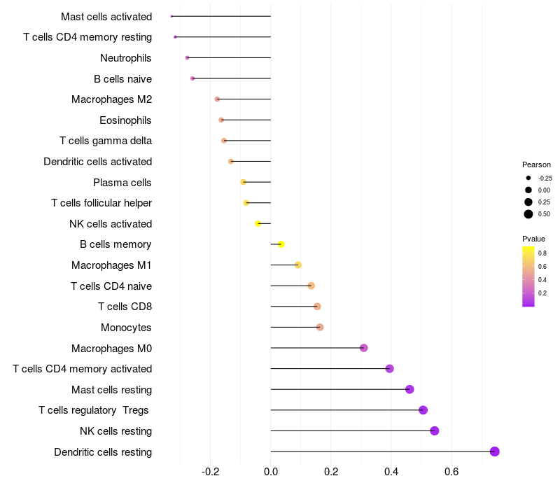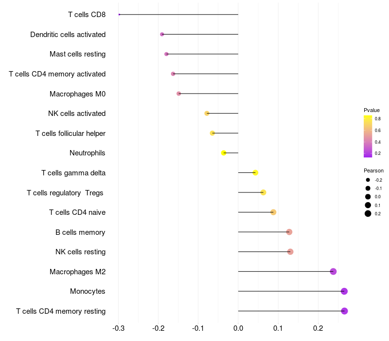 Lollipop of ITLN1 expression and immune infiltrating cell level correlation result in HTLV1+ samples