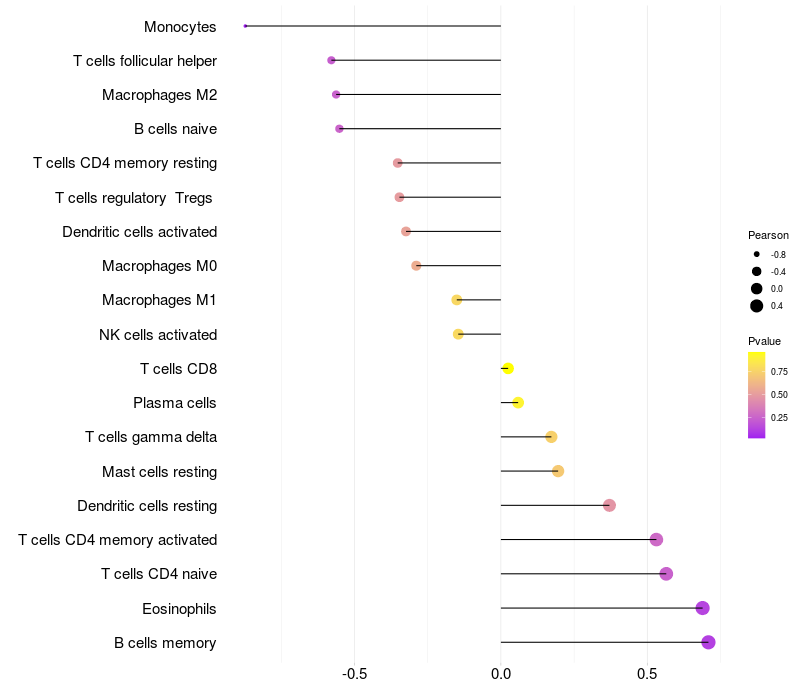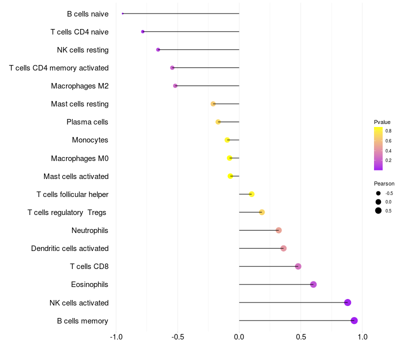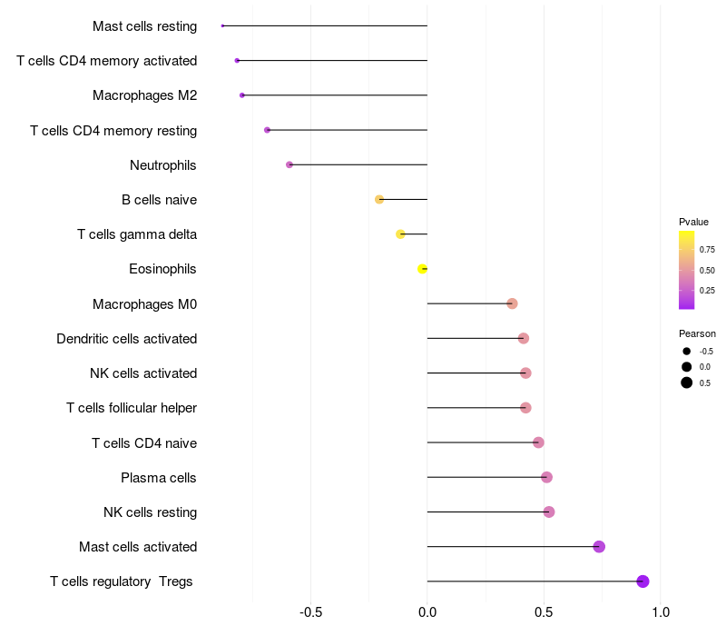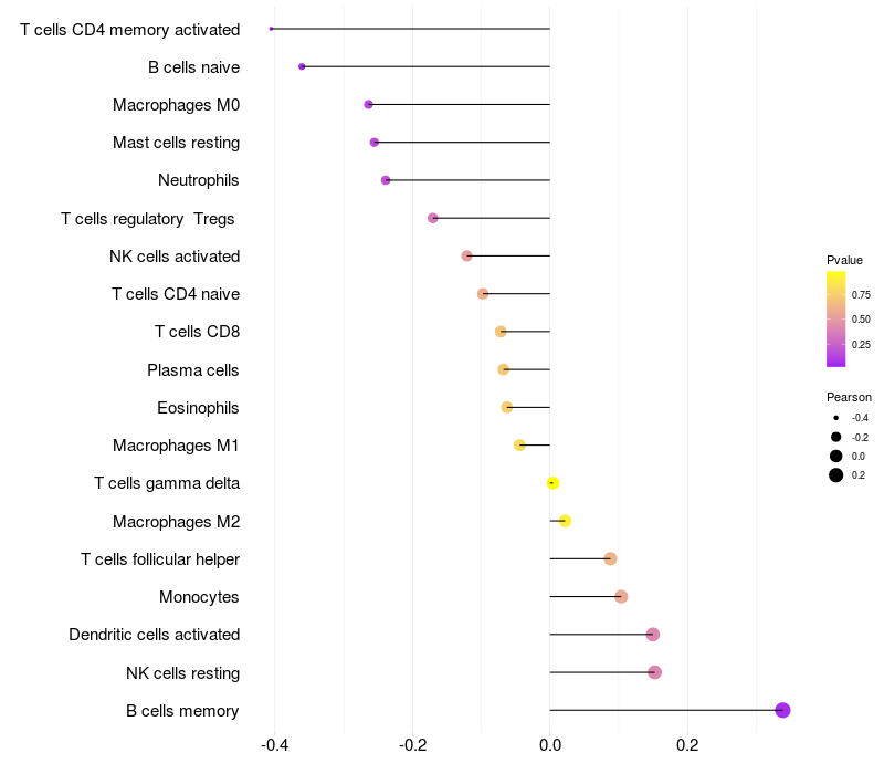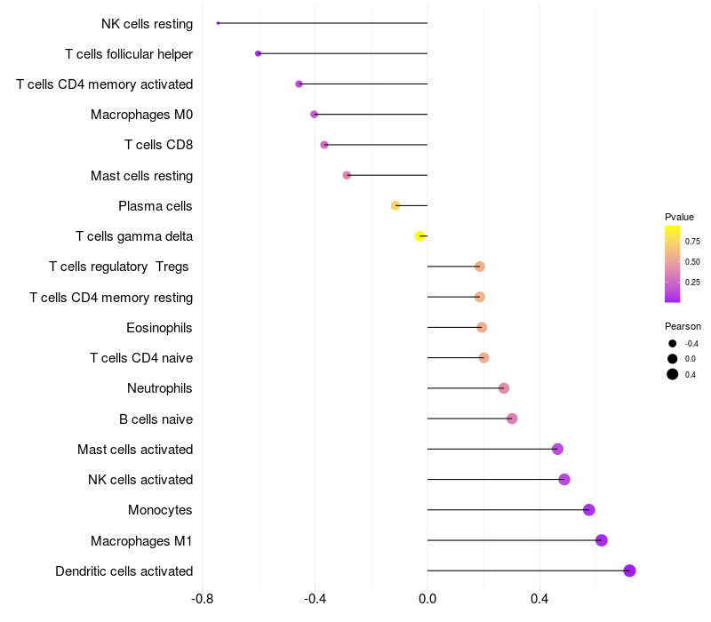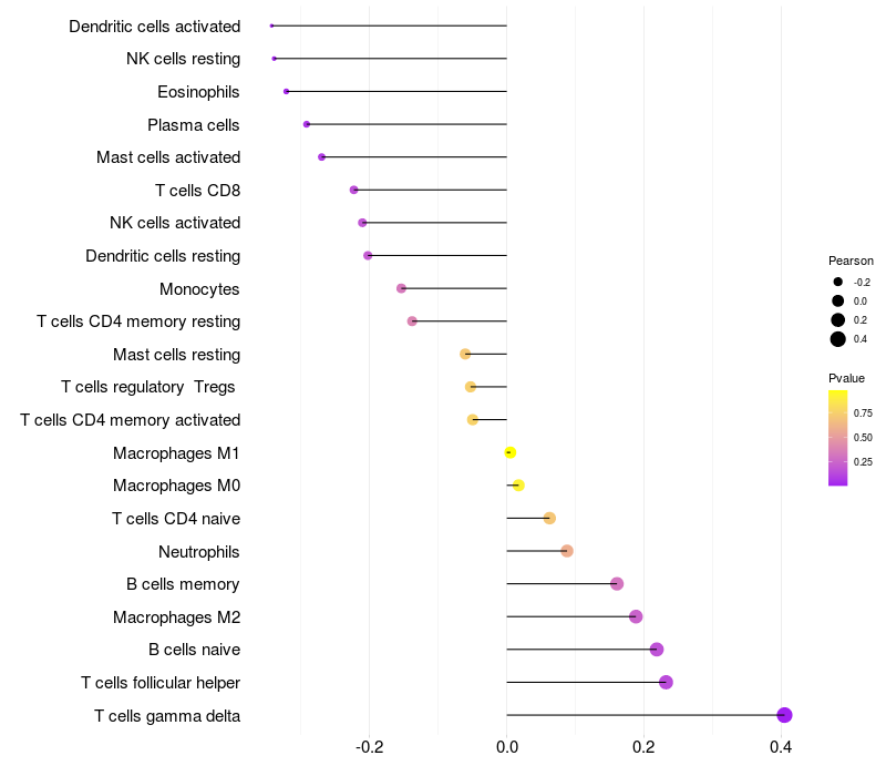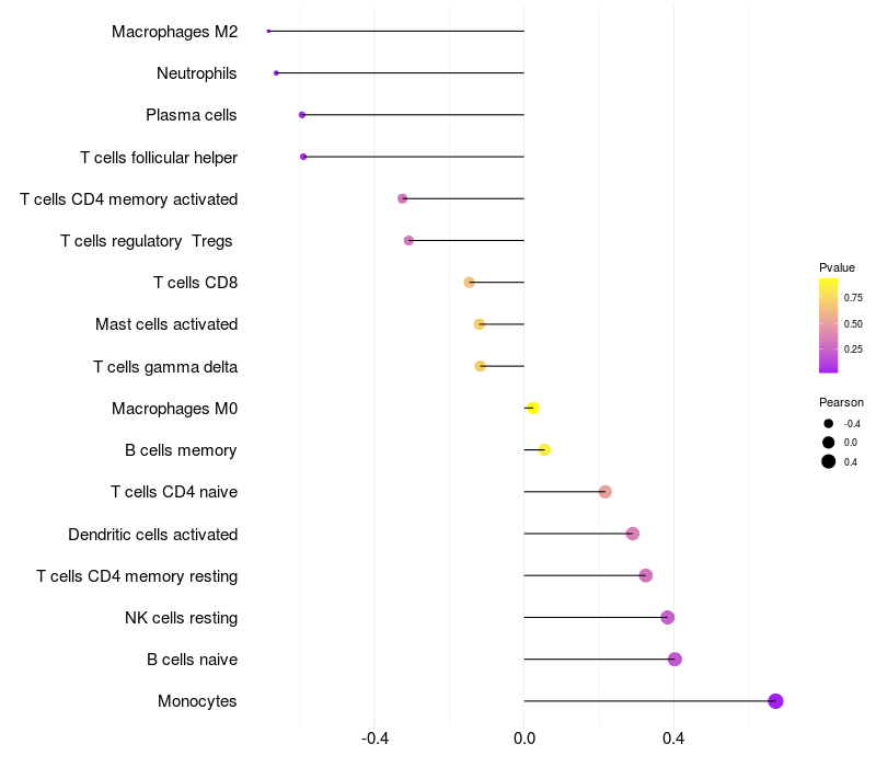 Lollipop of ITPR2 expression and immune infiltrating cell level correlation result in EBV+ samples