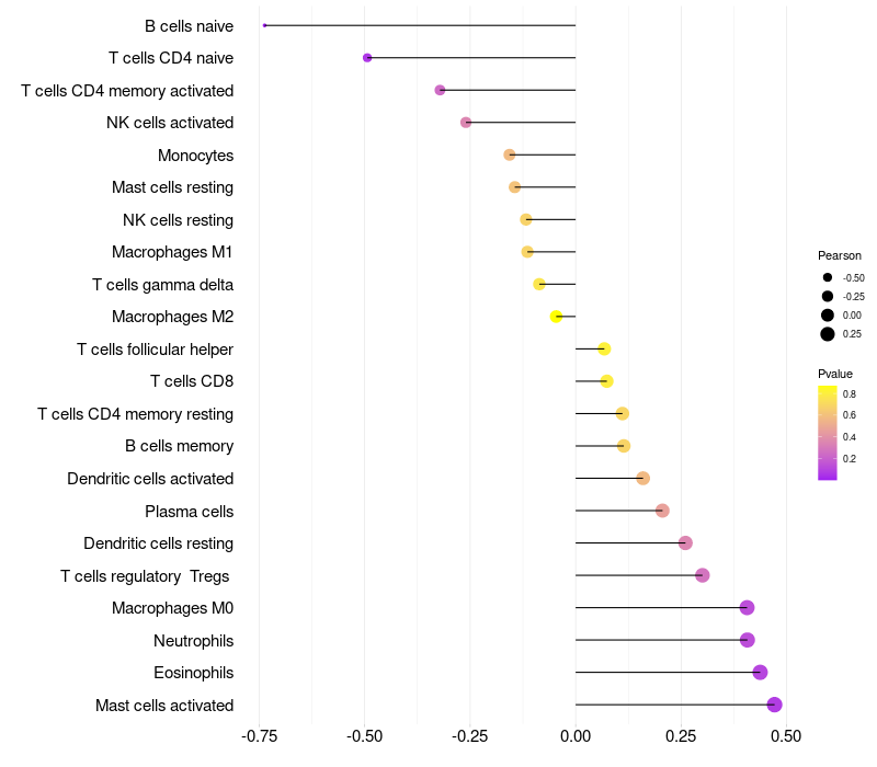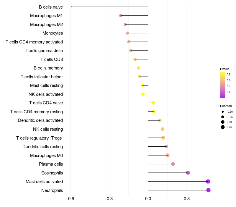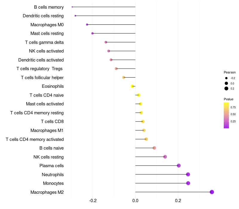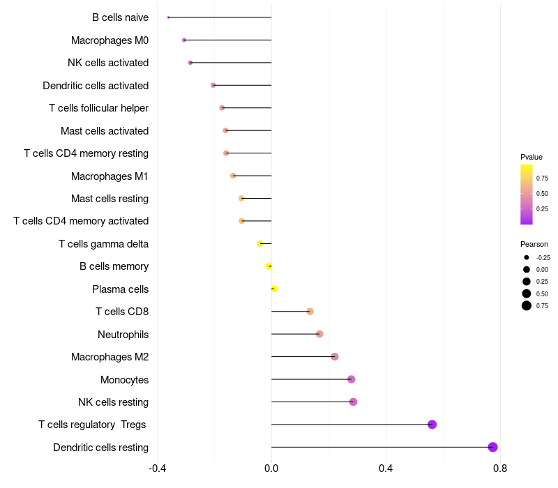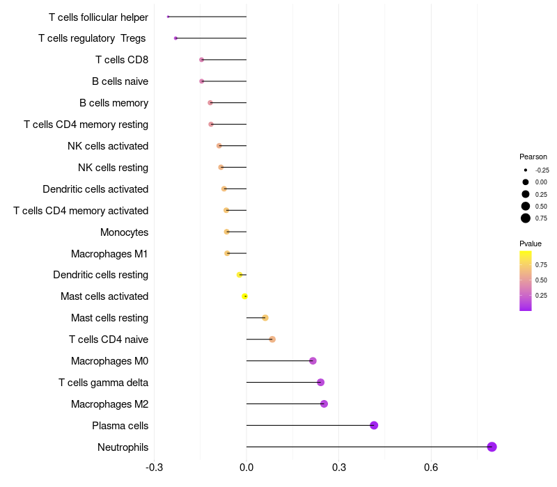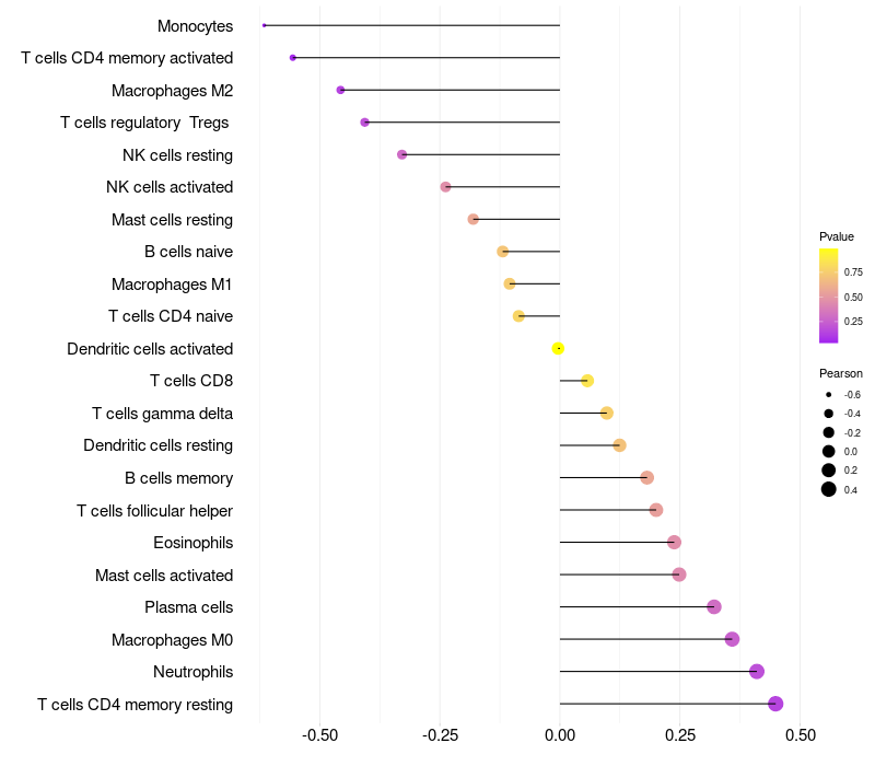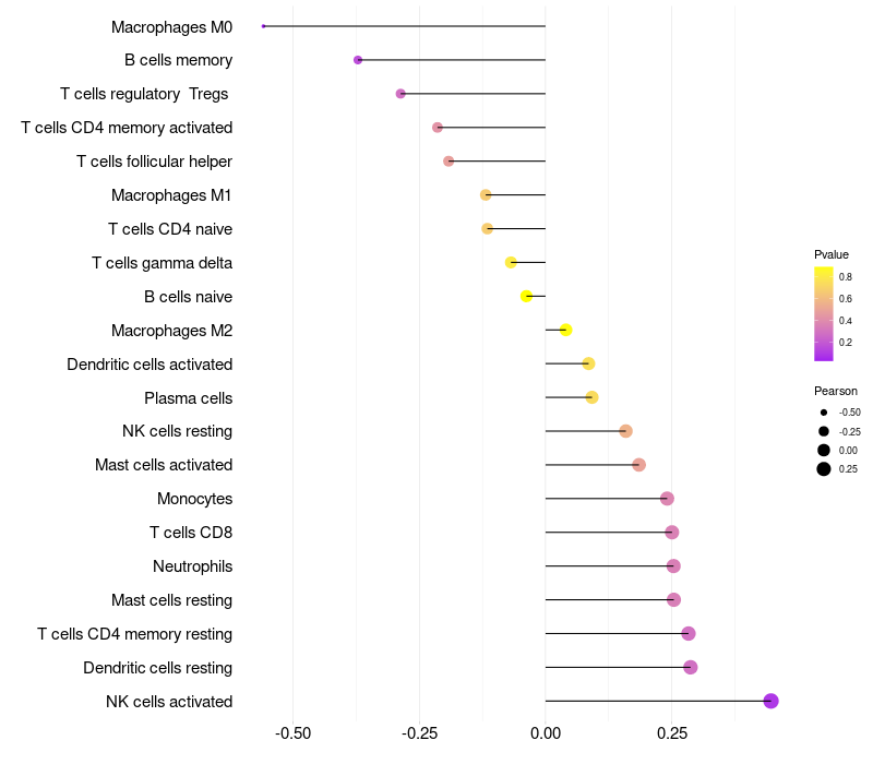 Lollipop of IVL expression and immune infiltrating cell level correlation result in HPV+ samples