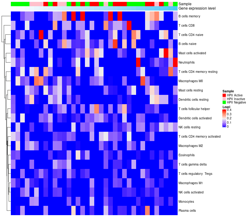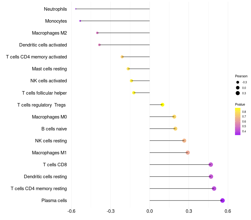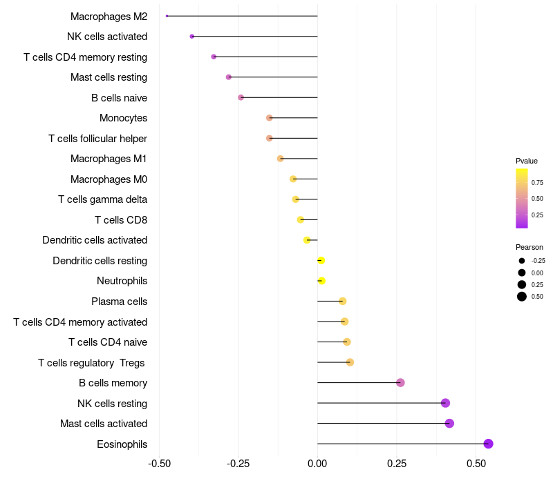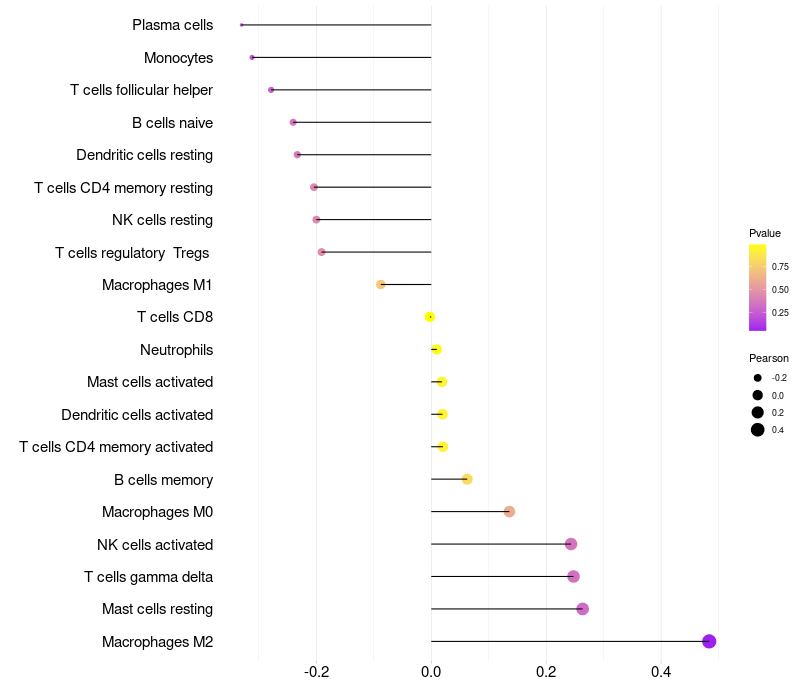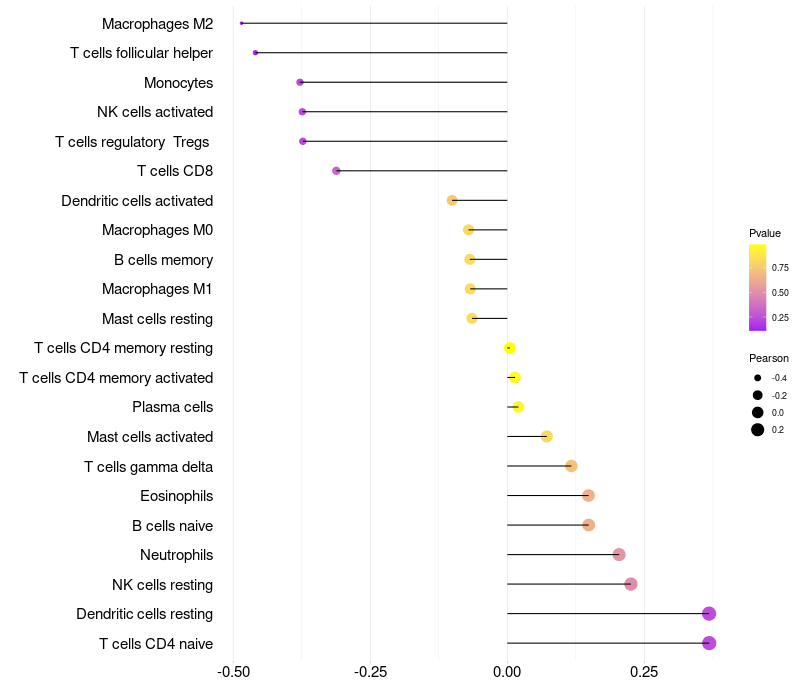 Lollipop of IYD expression and immune infiltrating cell level correlation result in HPV+ samples
