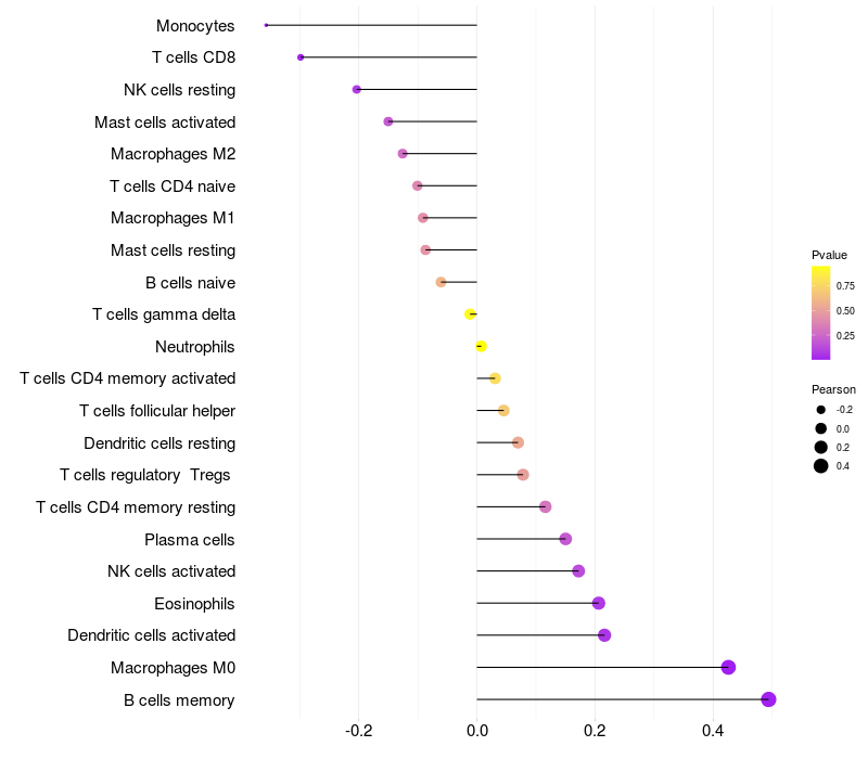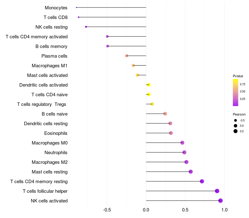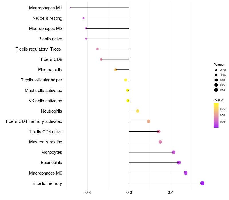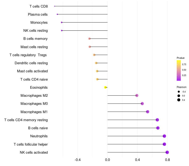 Lollipop of JAG1 expression and immune infiltrating cell level correlation result in HBV+ Liver cirrhosis samples