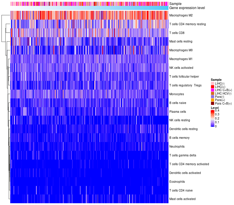 Liver hepatocellular carcinoma HCV (HBV+)(86), Liver hepatocellular carcinoma HCV (HBV-)(19), Liver hepatocellular carcinoma (HBV+)(209), Liver hepatocellular carcinoma (HBV+)(60), Paracancerous HCV (HBV+)(4), Paracancerous (HBV-)(28), Paracancerous (HBV+)(18) |