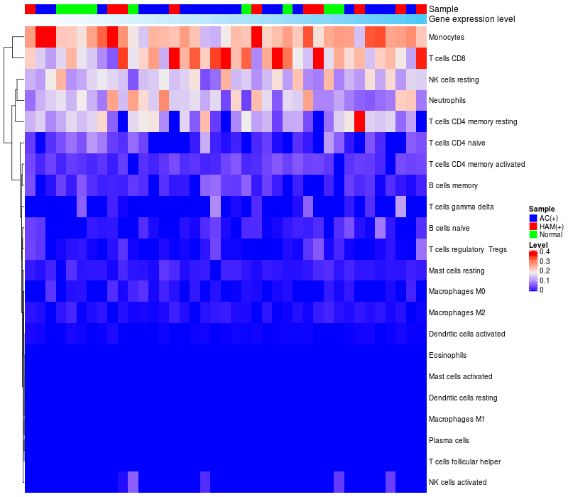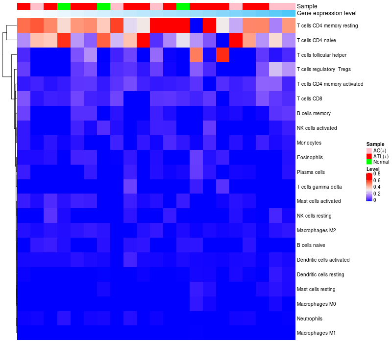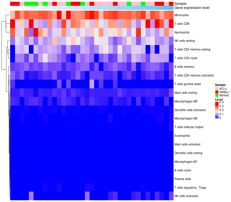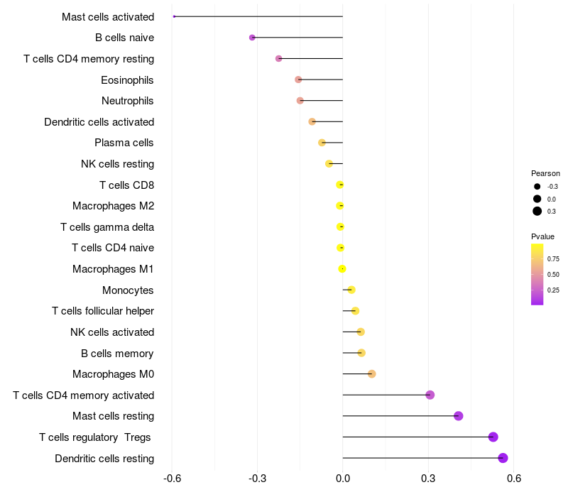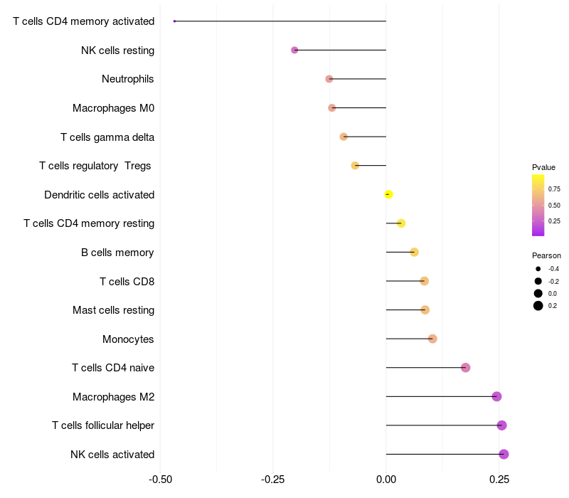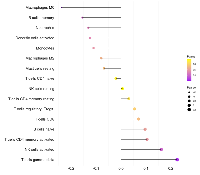 Lollipop of JAG2 expression and immune infiltrating cell level correlation result in HTLV1+ samples