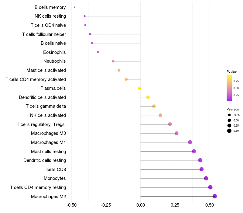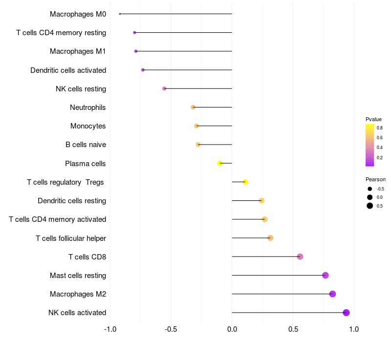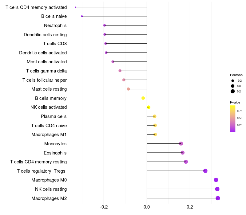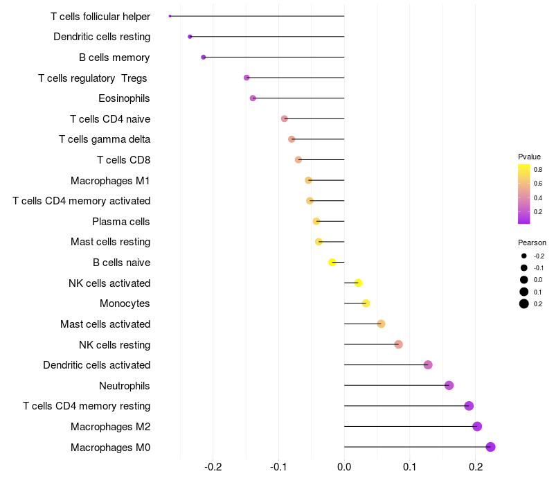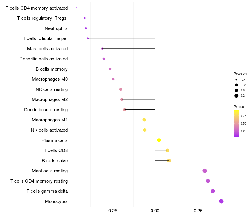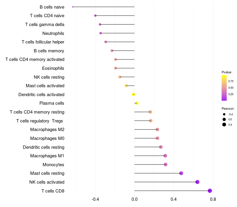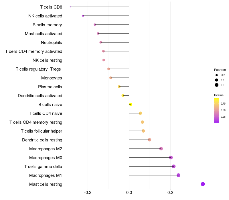 Lollipop of KANK2 expression and immune infiltrating cell level correlation result in HPV+ samples