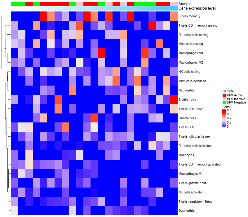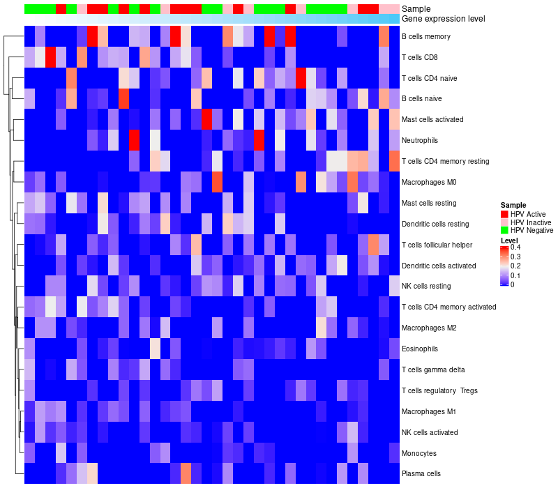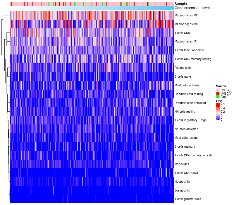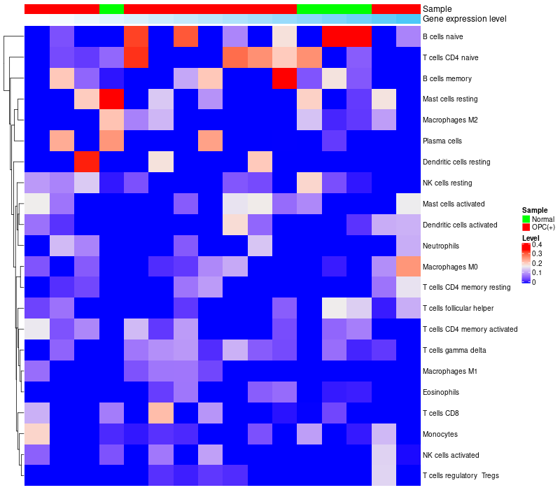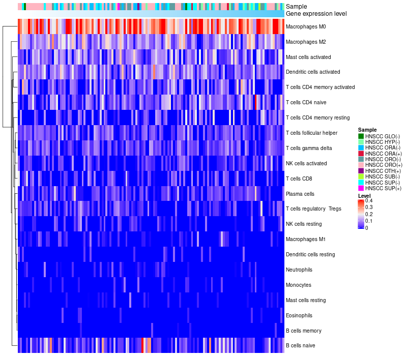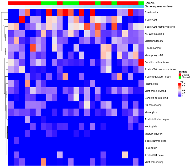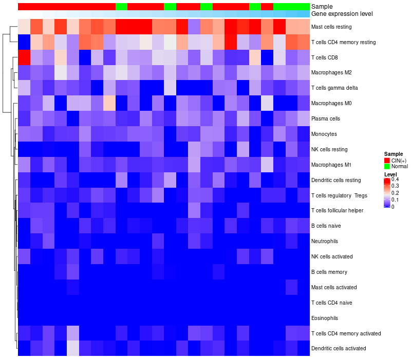 • Left: Heatmap of target gene expression and the level of various types of immune cells (cell type fractions) in all samples based on CIBERSORT method.