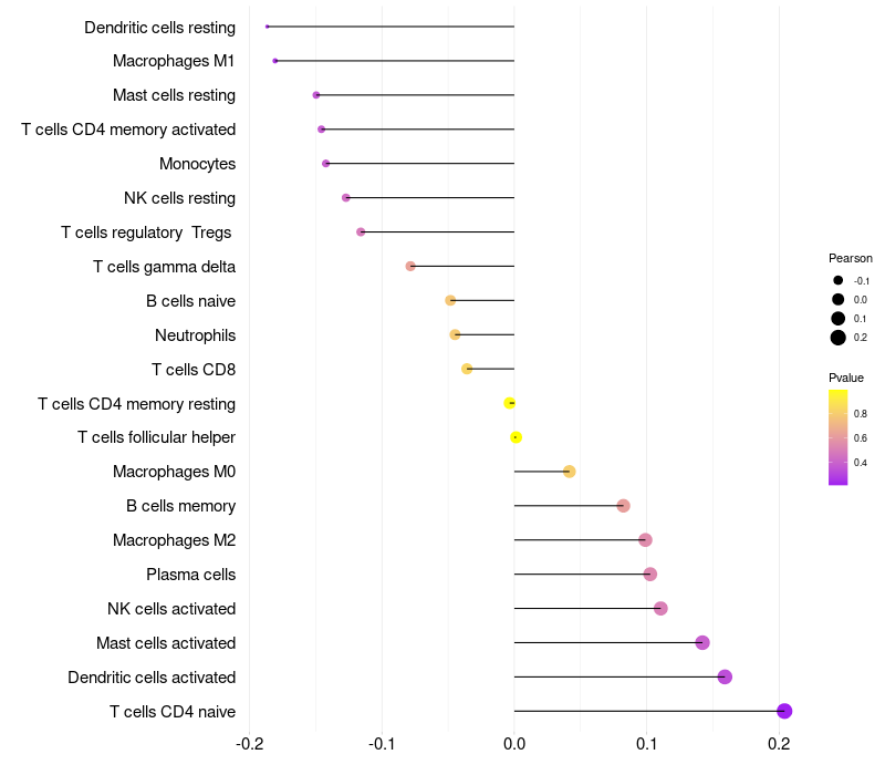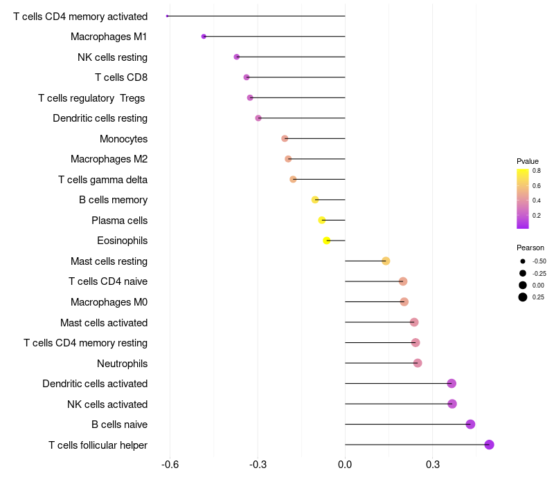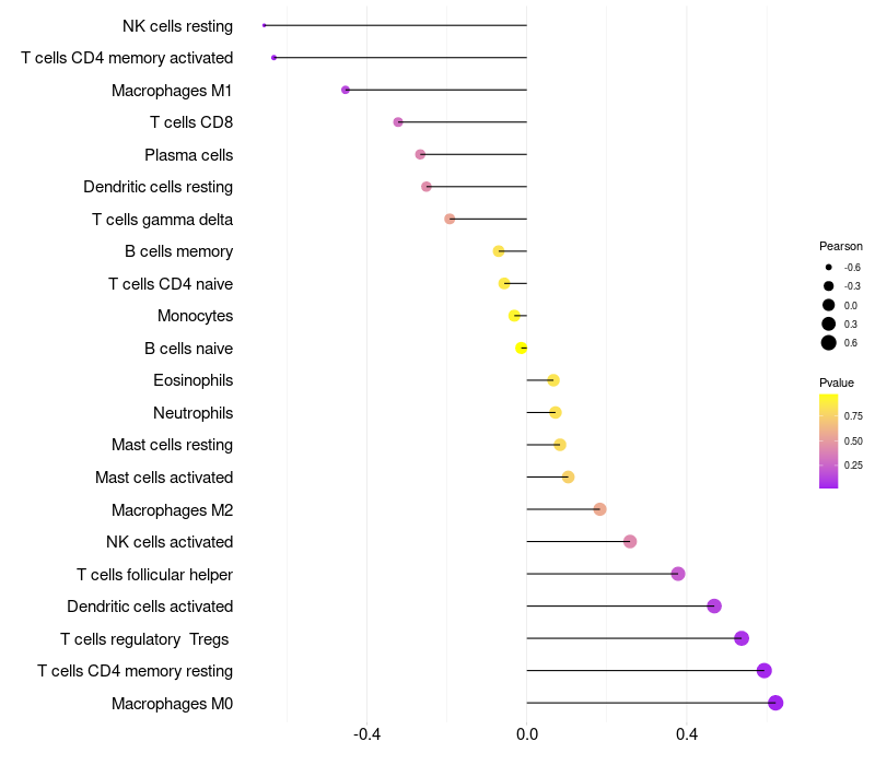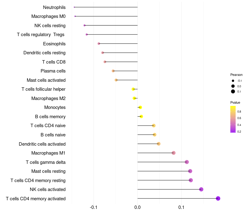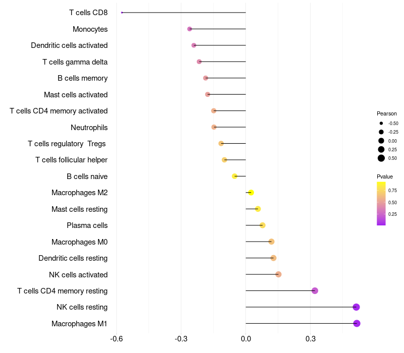 HeatMap of cell type fractions in all samples Lollipop of KCNG1 expression and immune infiltrating cell level correlation result in HPV+ samples