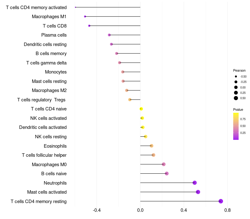 • Right: Correlation of target gene expression and the level of various types of immune cells in virus positive samples (Pearson Correlation Coefficient).