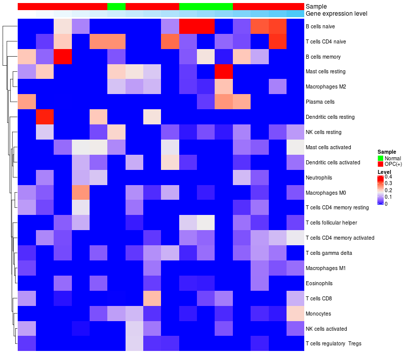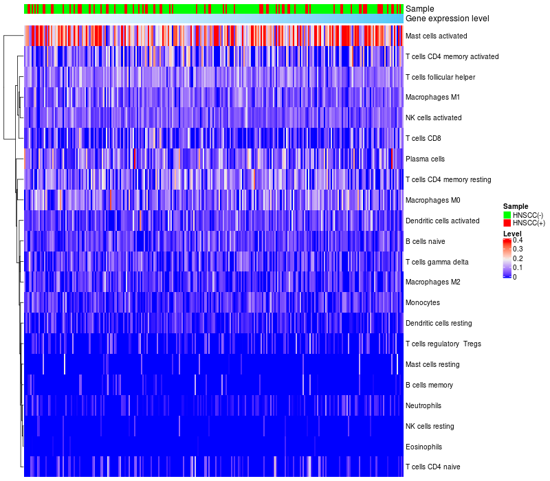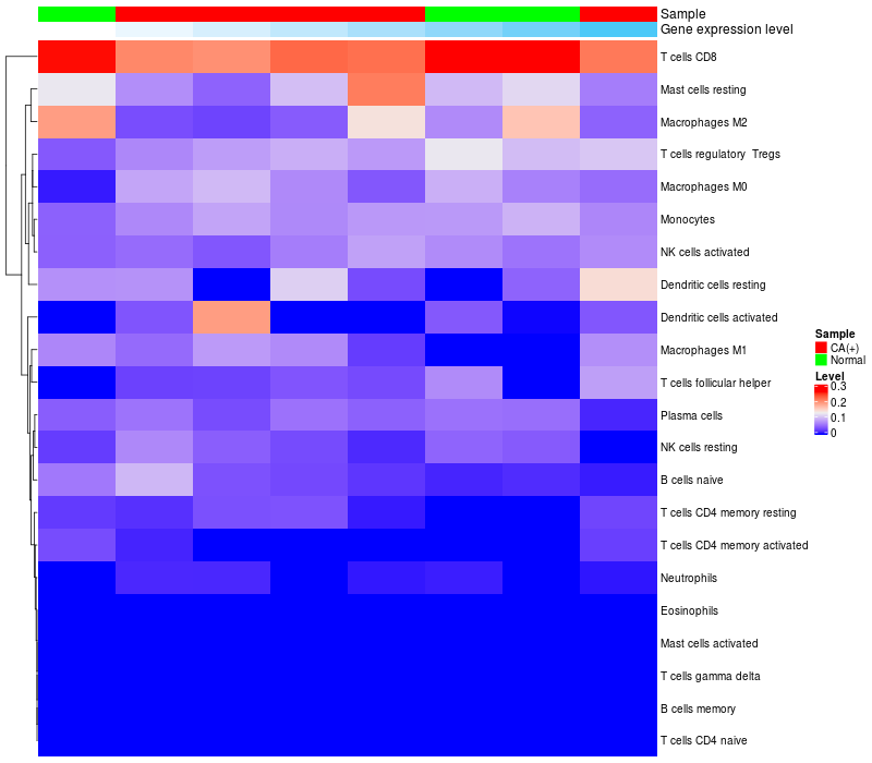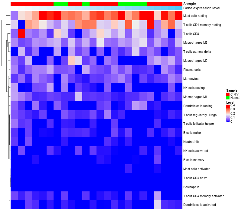 • Left: Heatmap of target gene expression and the level of various types of immune cells (cell type fractions) in all samples based on CIBERSORT method.