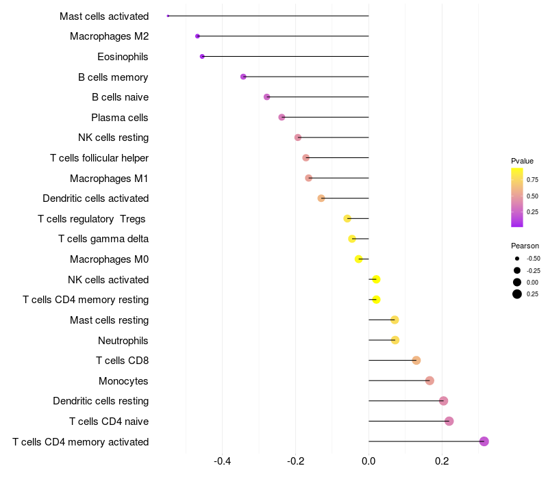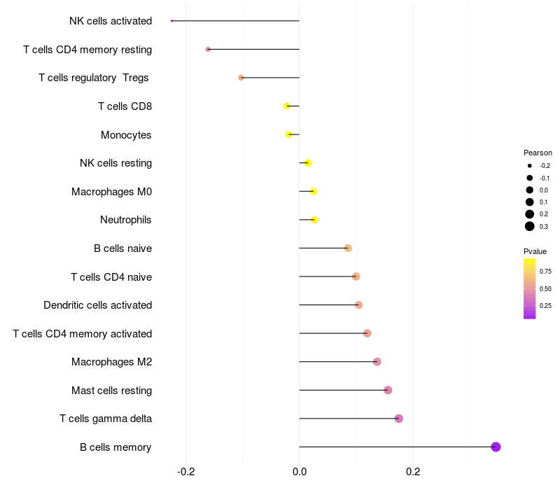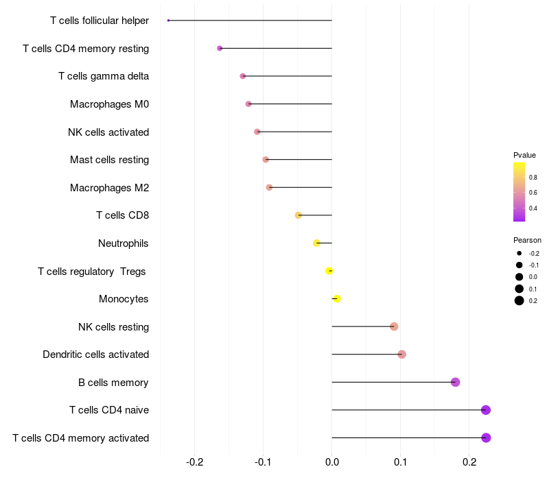 Lollipop of KCNK9 expression and immune infiltrating cell level correlation result in HTLV1+ samples
