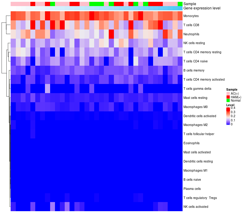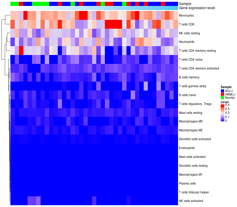 Normal (8), Asymptomatic carriers (HTLV1+)(17), HTLV-1-associated myelopathy (HTLV1+)(10) |